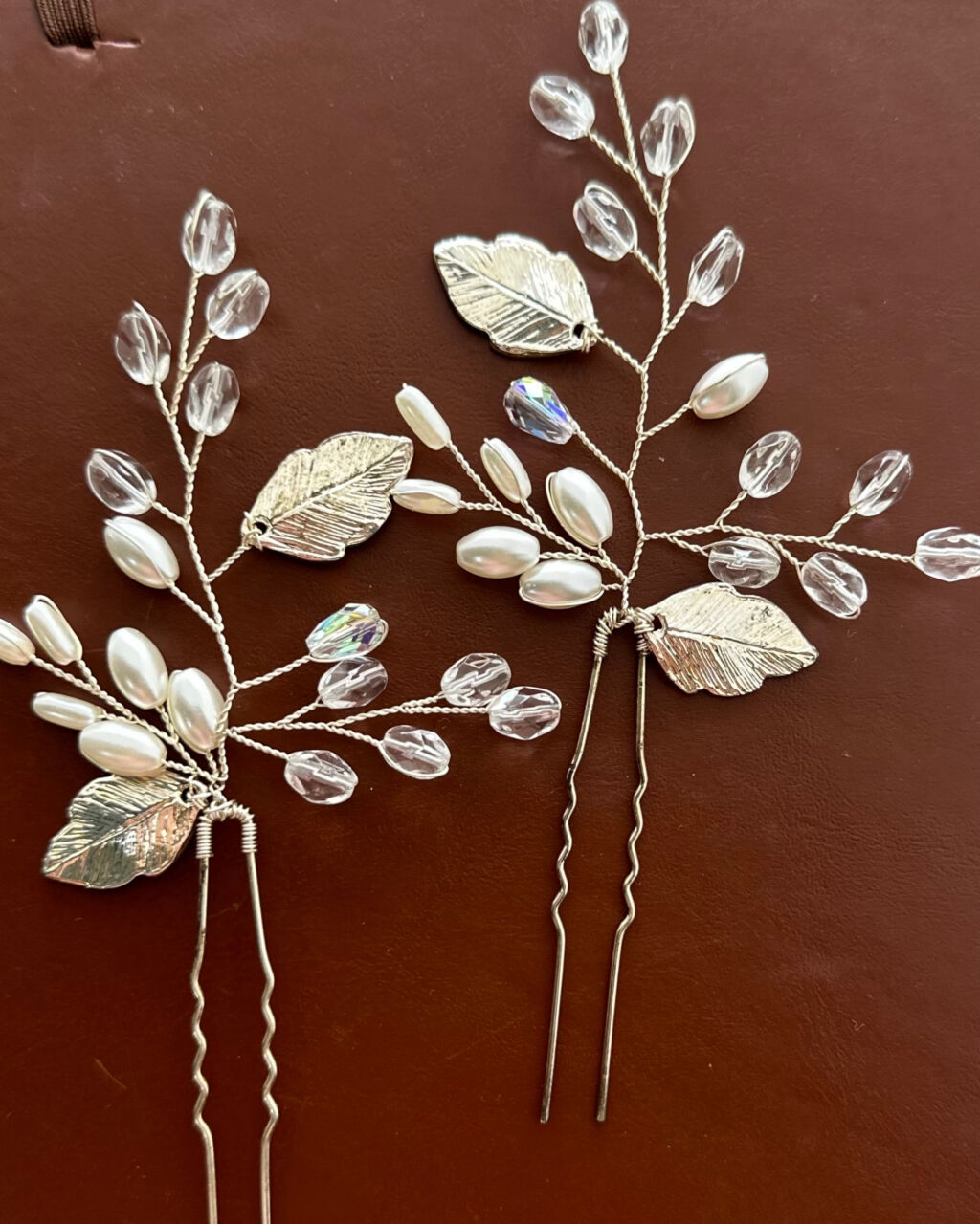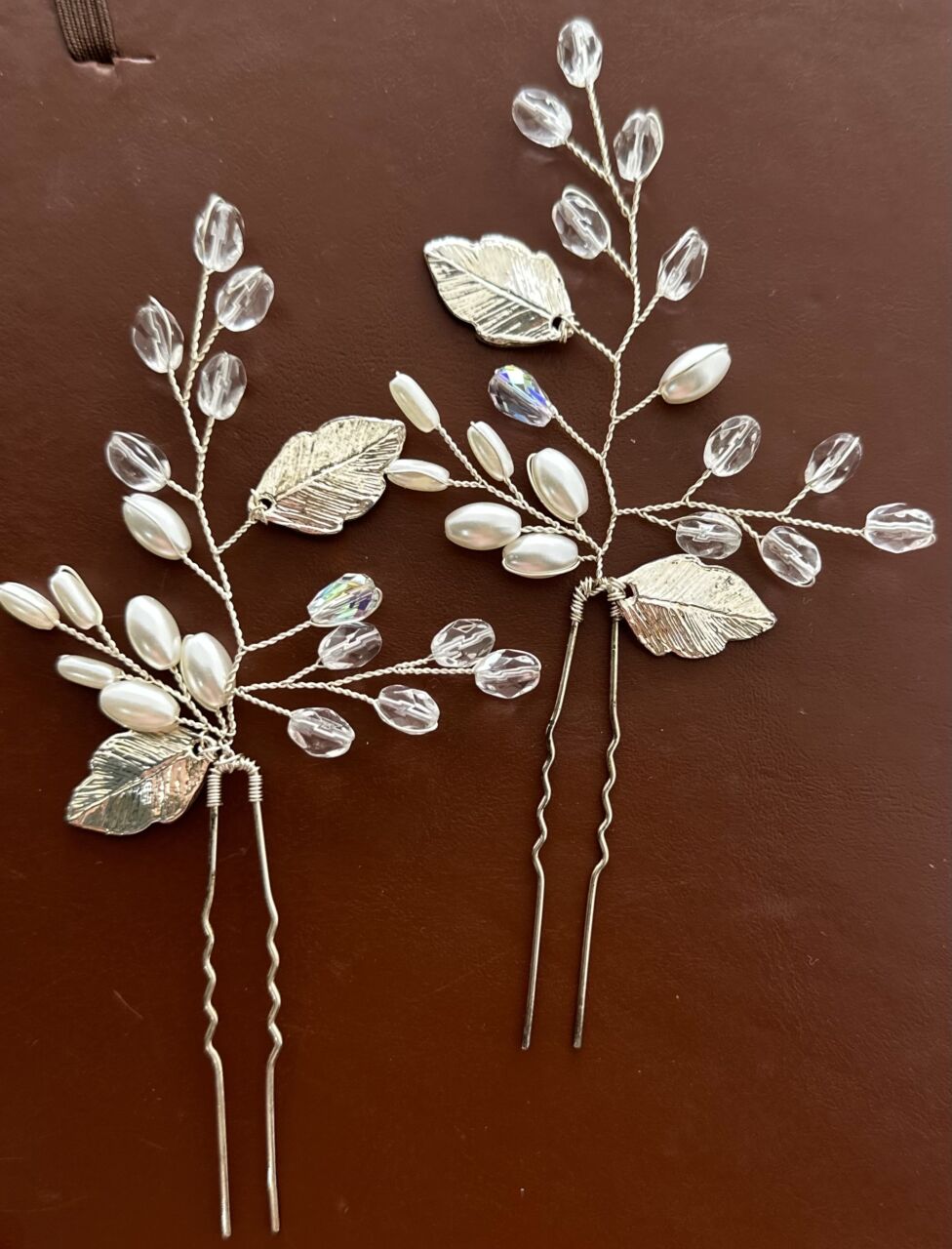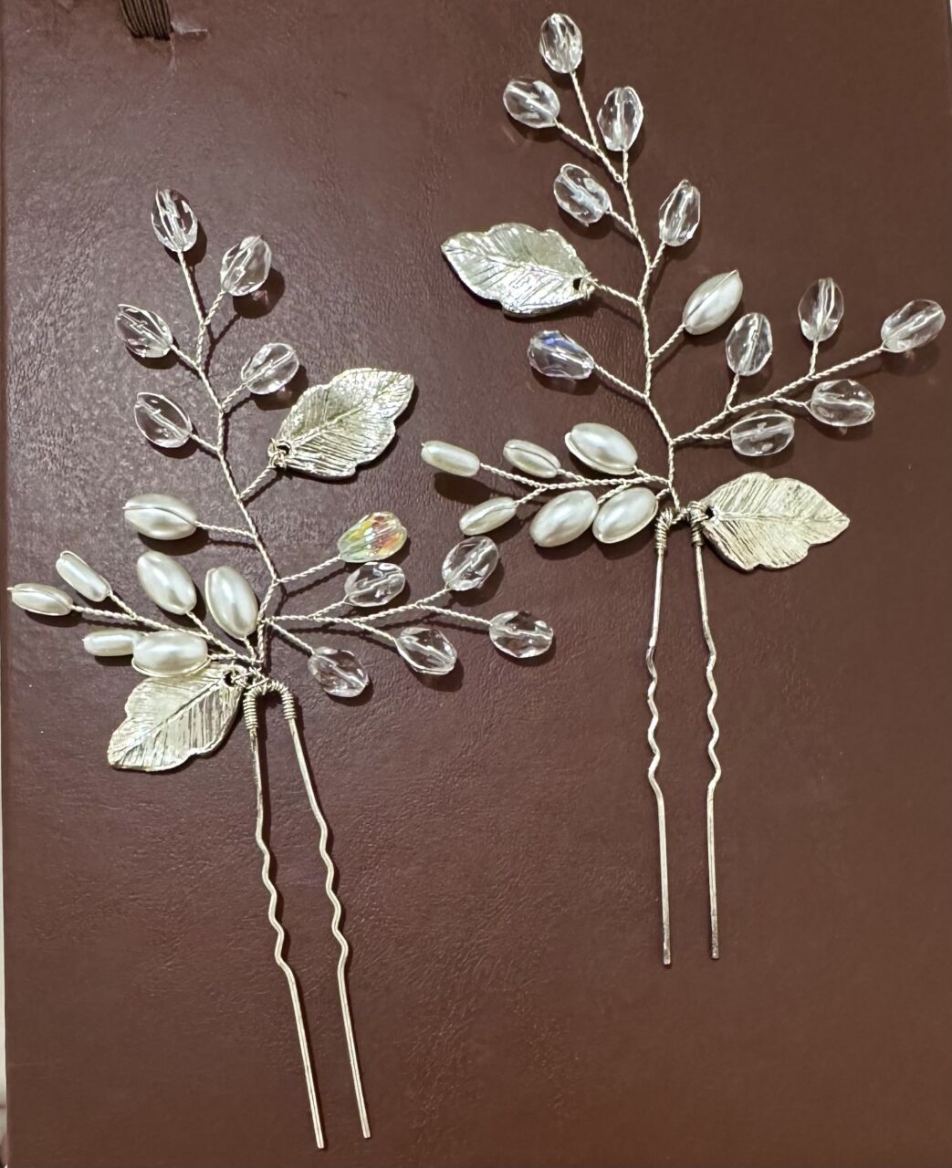 Apresenta defeito ou desgaste: Par de tiara maleável com grampos com banho em prata com pedras e pérolas, grampo com mínimo desgaste.