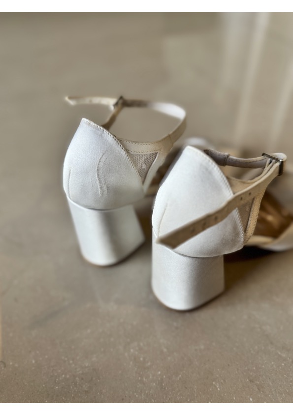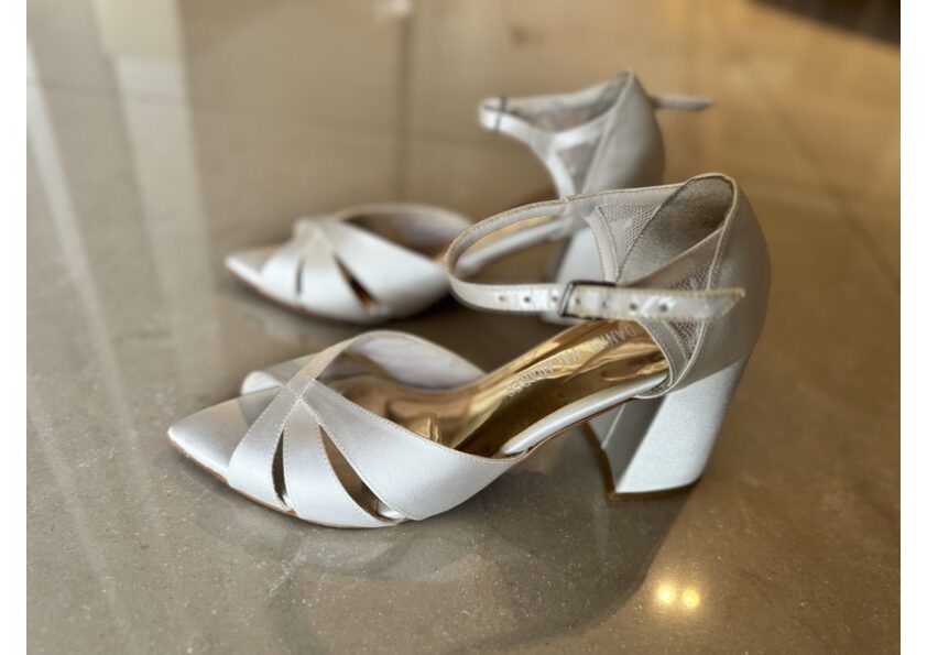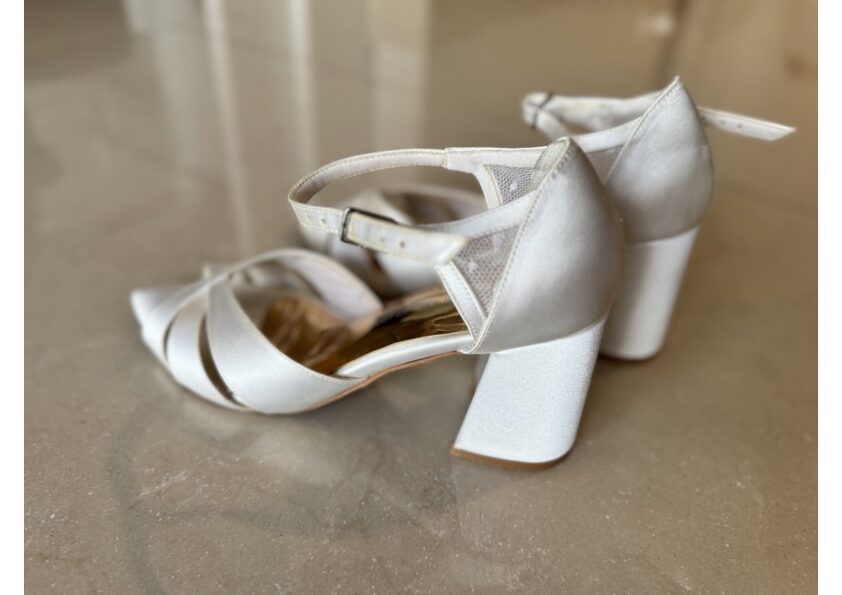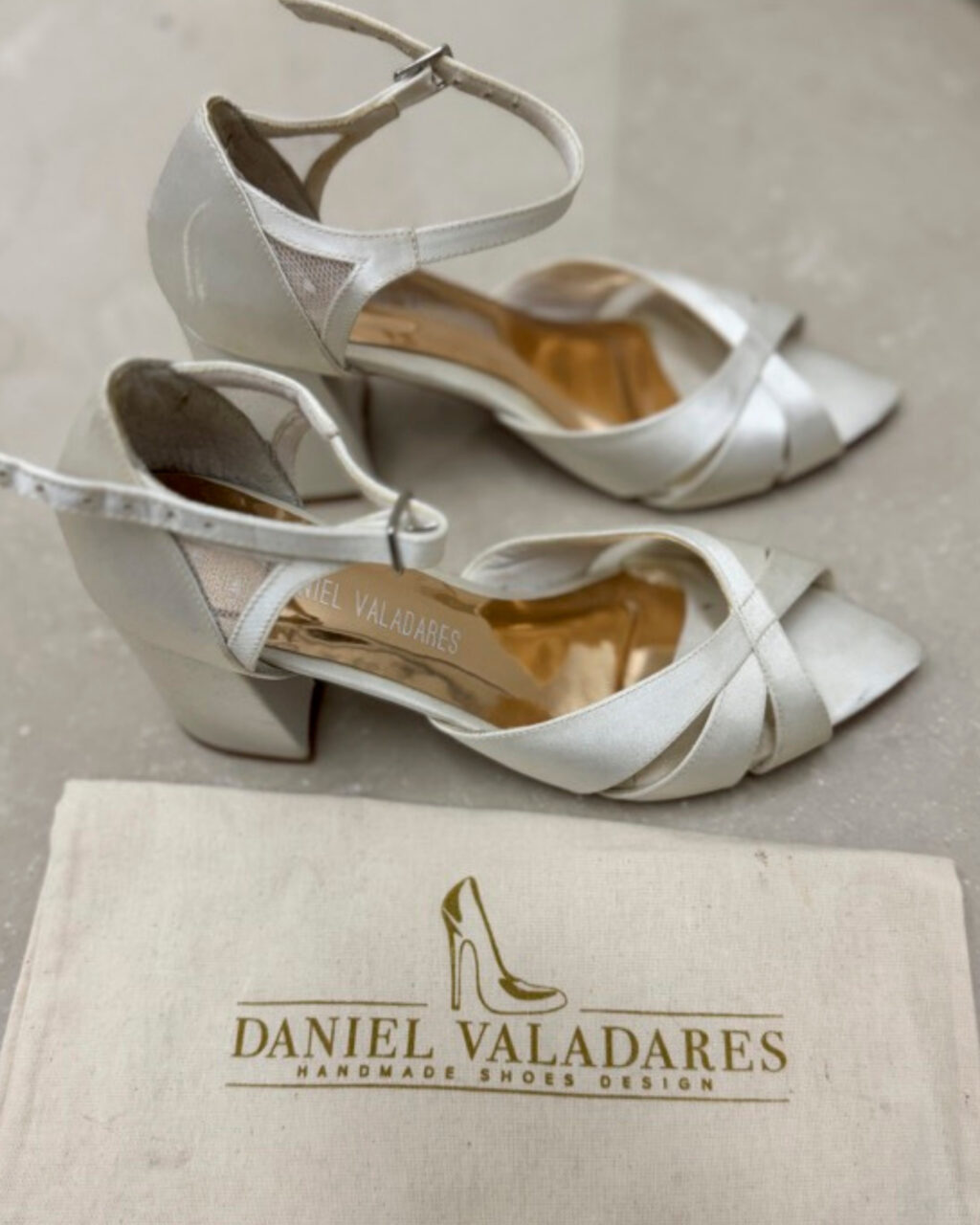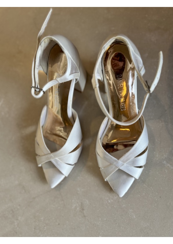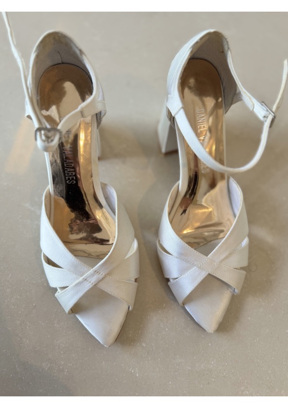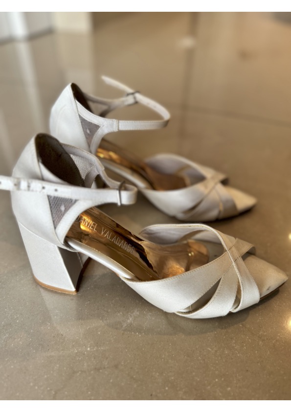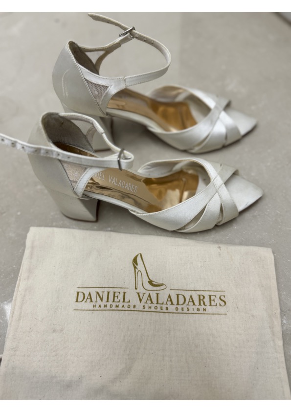 Apresenta defeito ou desgaste: Sandália noiva off white em cetim marca Daniel Valadares, ótimo estado, acompanha dustbag. Desgastes: arranhado na parte do calcanhar lado esquerdo, resquício de cola no apoio interno calcanhar de um dos lados, onde foi colado um silicone. Foi limpa mas as tiras estão levemente encardidas.