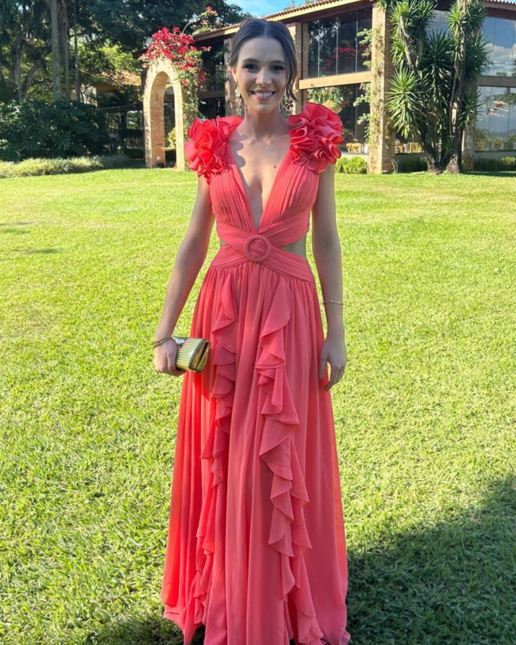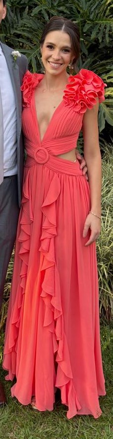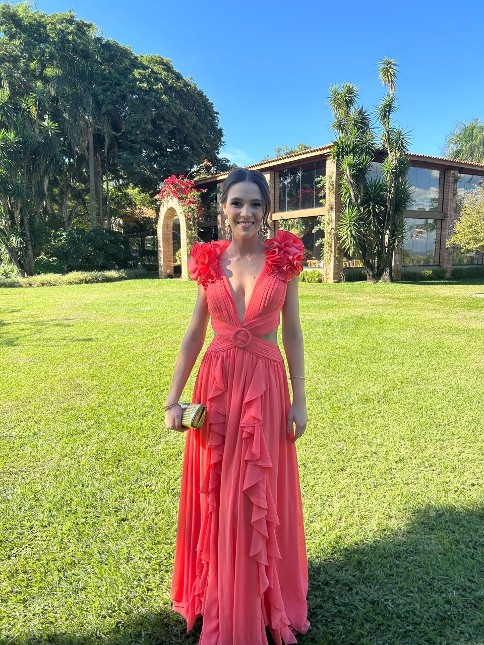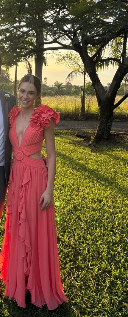 Apresenta defeito ou desgaste: O vestido apresenta dois fiozinhos puxados no saiote, imperceptíveis. Veste até um tamanho 38 ou pessoas com mais ou menos busto, em razão da amarração ser ajustável na parte de trás.