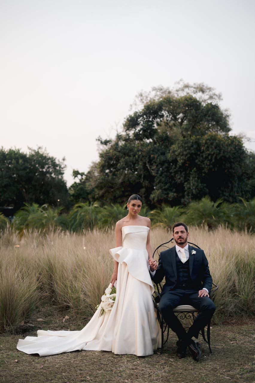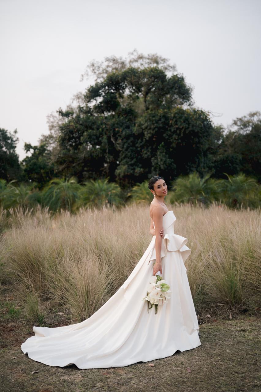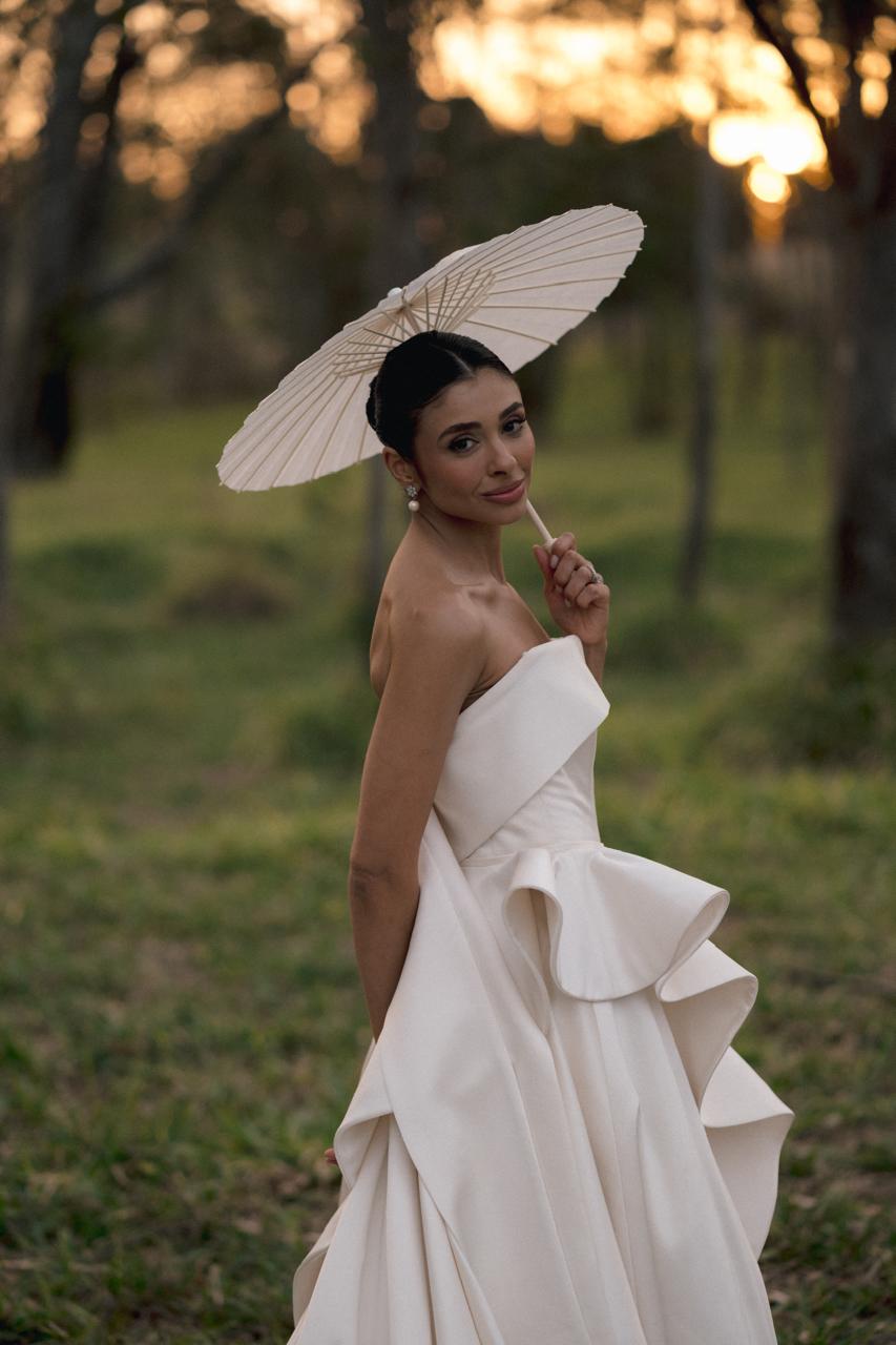 Apresenta defeito ou desgaste: Vestido de noiva em crepe 100% seda, no tom off-white perolado, com um brilho sutil e elegante. Acompanha saia peplum removível com acabamento em crinol, que cria uma onda moderna e fashionista, perfeita para transformar o look entre cerimônia e festa. Pode ser usado com ou sem o peplum. O corpo do vestido traz uma pala assimétrica drapeada, feita em moulage, que abraça o busto e segue até as costas, formando uma cauda fluida. Modelagem evasê, com cauda longa (possui opção de recolha) e fechamento por zíper. Inclui véu e saiote duplo de tule para dar volume na saia. O vestido está em ótimo estado, apresentando apenas leves desgastes na barra, algo comum em peças 100% seda e que pode ser facilmente eliminado ao ajustar a barra. A peça foi lavada em lavanderia profissional e especializada. Acompanha capa da marca.