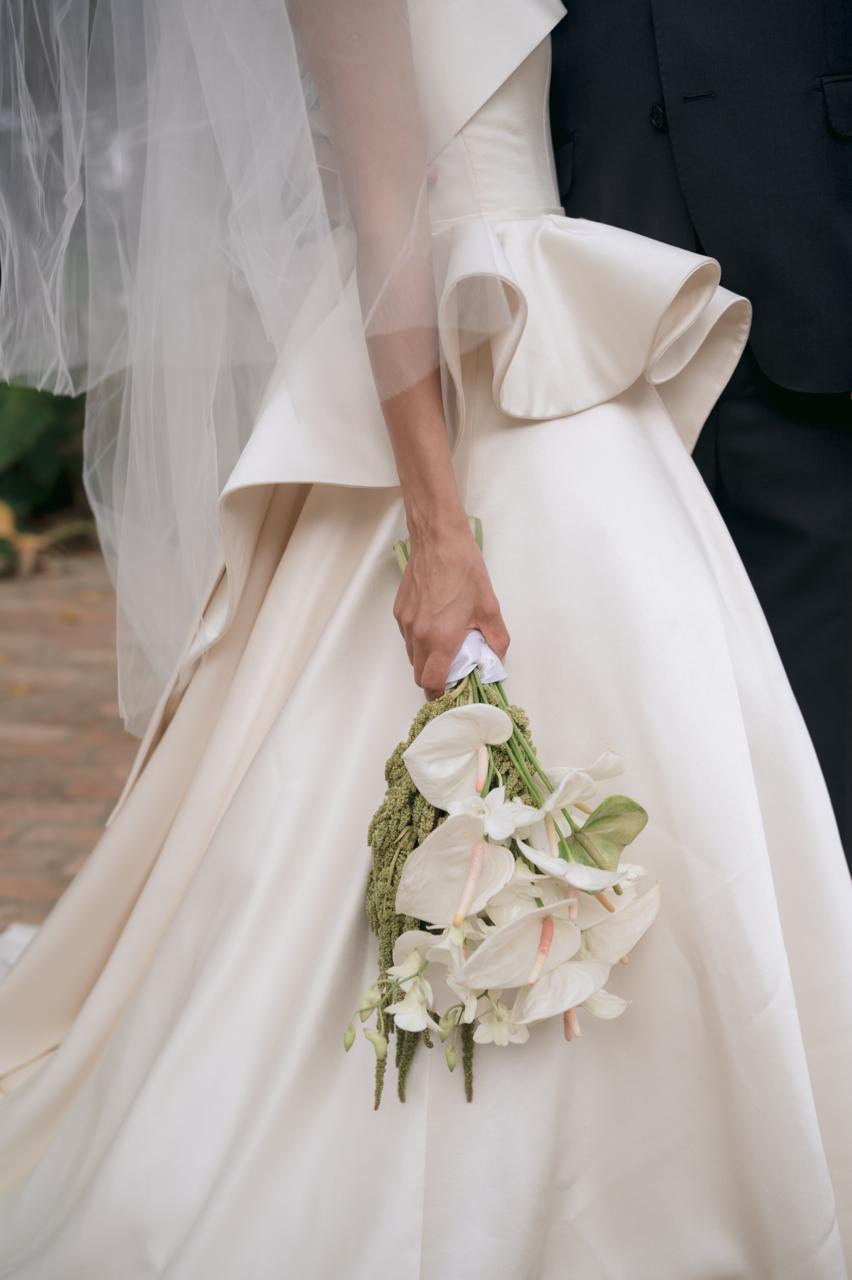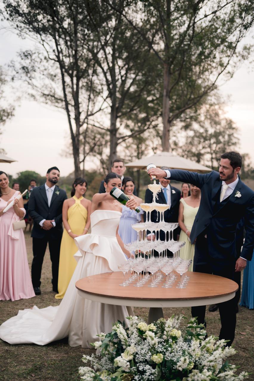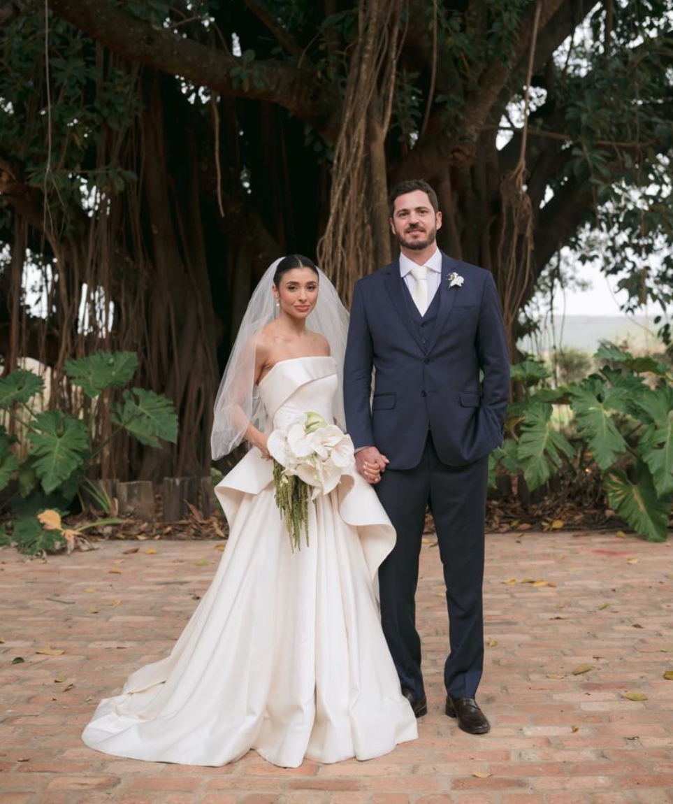 Apresenta defeito ou desgaste: Vestido de noiva em crepe 100% seda, no tom off-white perolado, com um brilho sutil e elegante. Acompanha saia peplum removível com acabamento em crinol, que cria uma onda moderna e fashionista, perfeita para transformar o look entre cerimônia e festa. Pode ser usado com ou sem o peplum. O corpo do vestido traz uma pala assimétrica drapeada, feita em moulage, que abraça o busto e segue até as costas, formando uma cauda fluida. Modelagem evasê, com cauda longa (possui opção de recolha) e fechamento por zíper. Inclui véu e saiote duplo de tule para dar volume na saia. O vestido está em ótimo estado, apresentando apenas leves desgastes na barra, algo comum em peças 100% seda e que pode ser facilmente eliminado ao ajustar a barra. A peça foi lavada em lavanderia profissional e especializada. Acompanha capa da marca.