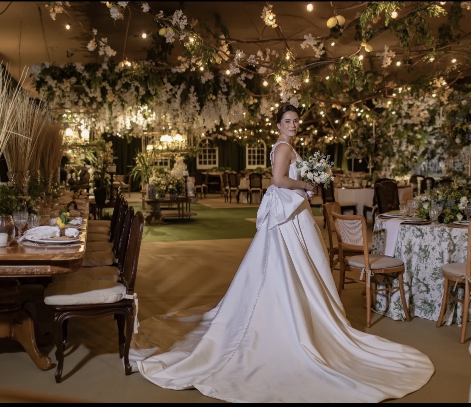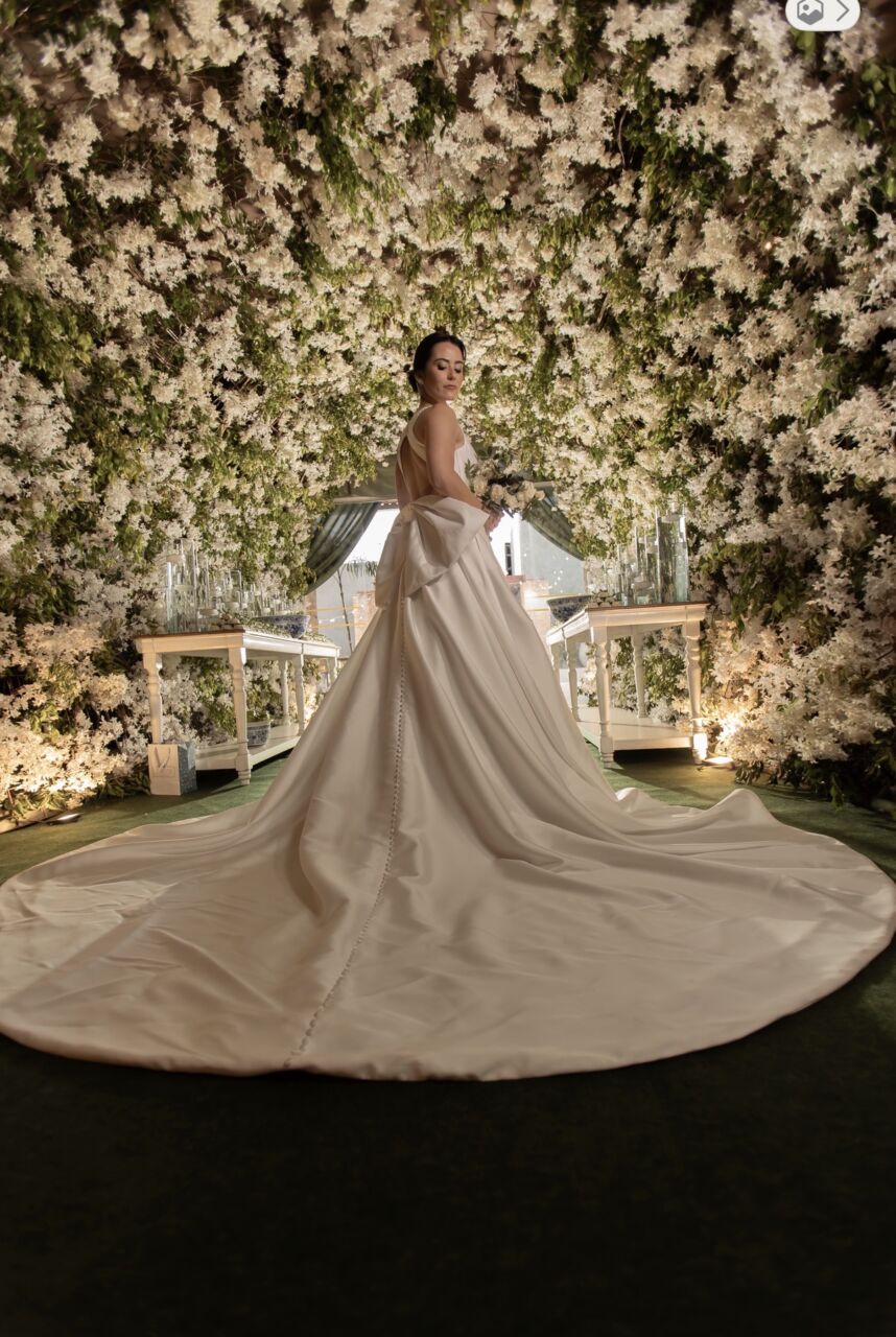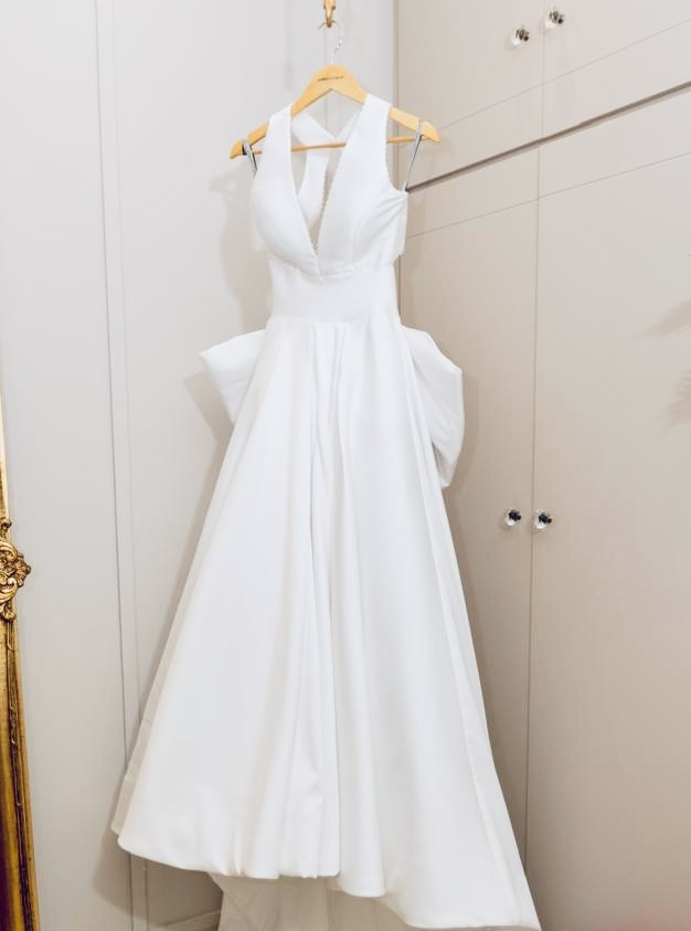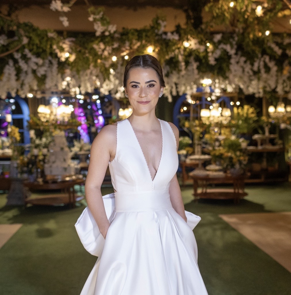 Vestido Gabrieli Furlan em Mikado de Seda com Laço Removível + Bolso + VéuMinimalista, elegante e atemporal, com decote V profundo e costas nadador.Saia godê duplo com caimento impecável e volume na medida certa.O laço removível permite duas propostas (clássico ou clean), com bolsos laterais discretos e delicadas aplicações de micro pérolas.Vestido leve, estruturado e extremamente confortável — usado uma única vez e já higienizado.