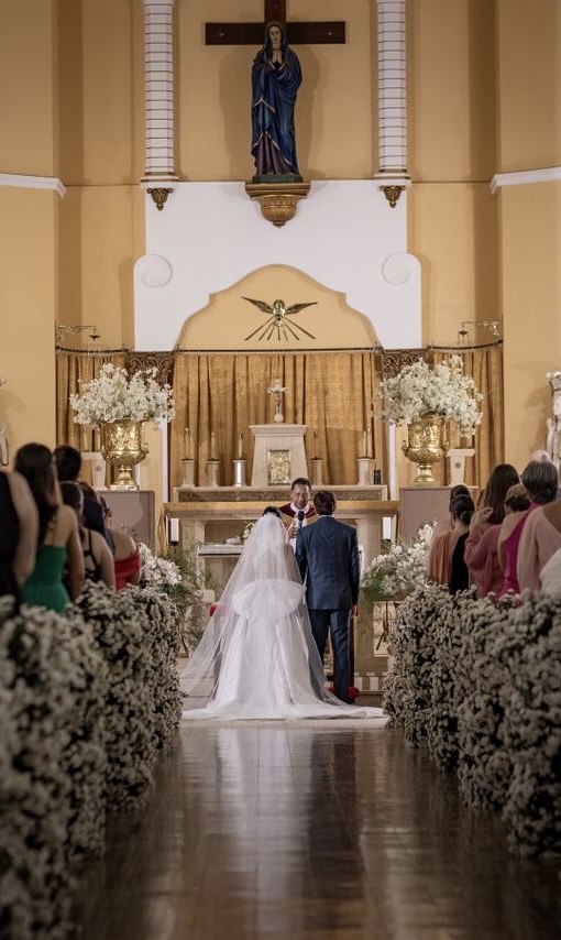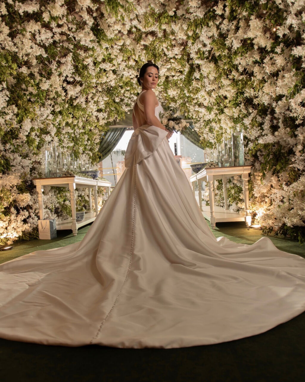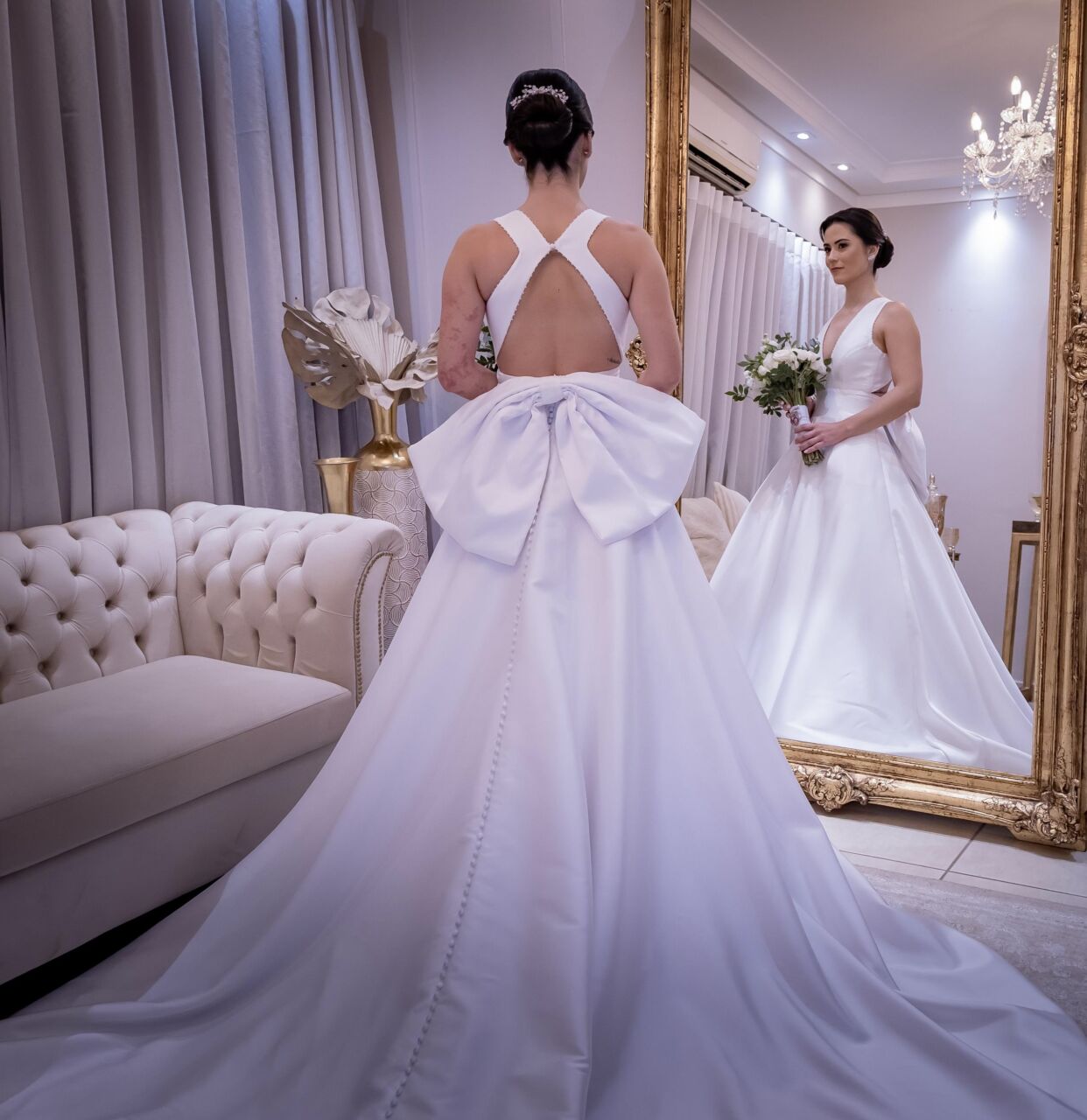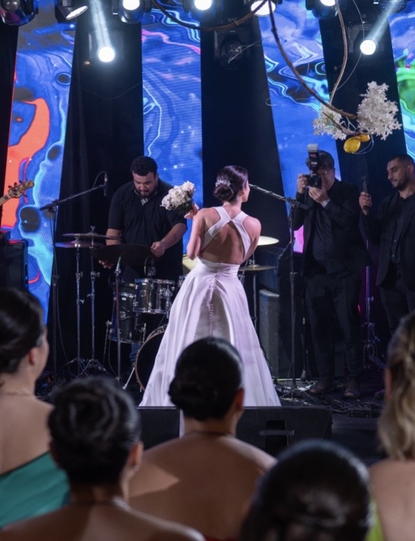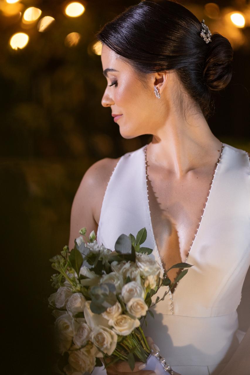 Vestido Gabrieli Furlan em Mikado de Seda com Laço Removível + Bolso + VéuMinimalista, elegante e atemporal, com decote V profundo e costas nadador.Saia godê duplo com caimento impecável e volume na medida certa.O laço removível permite duas propostas (clássico ou clean), com bolsos laterais discretos e delicadas aplicações de micro pérolas.Vestido leve, estruturado e extremamente confortável — usado uma única vez e já higienizado.