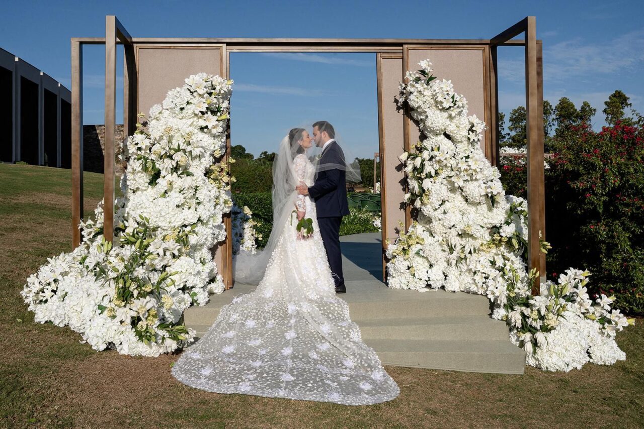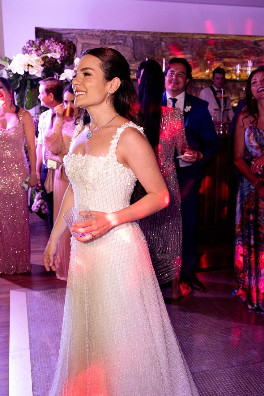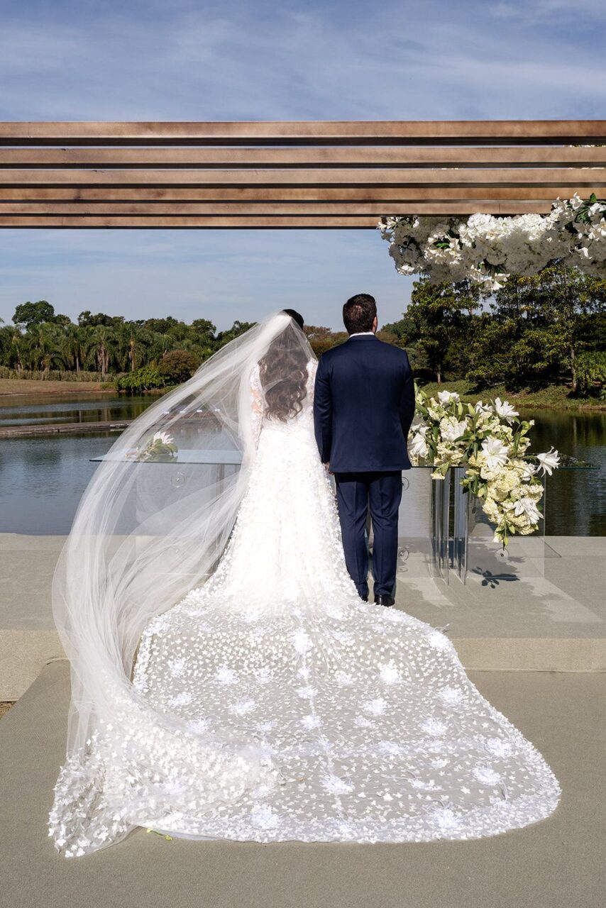São dois vestidos em um – a parte com a gola e as mangas é um vestido inteiro de renda que é colocado por cima do vestido de alça , ele é removível, ele possui um fechamento nas costas até a parte de baixo. A cauda é neste vestido de cima, então depois para festa, quando você tira o vestido de cima, o vestido fica sem cauda pra recolher. A parte de cima possui recolhimento de cauda. As flores são todas coladas a mão, um é tecido Oscar De La Renta e o outro Ellie Saab, foram 6 mulheres para bordar a mão flor por flor durante 60 dias.