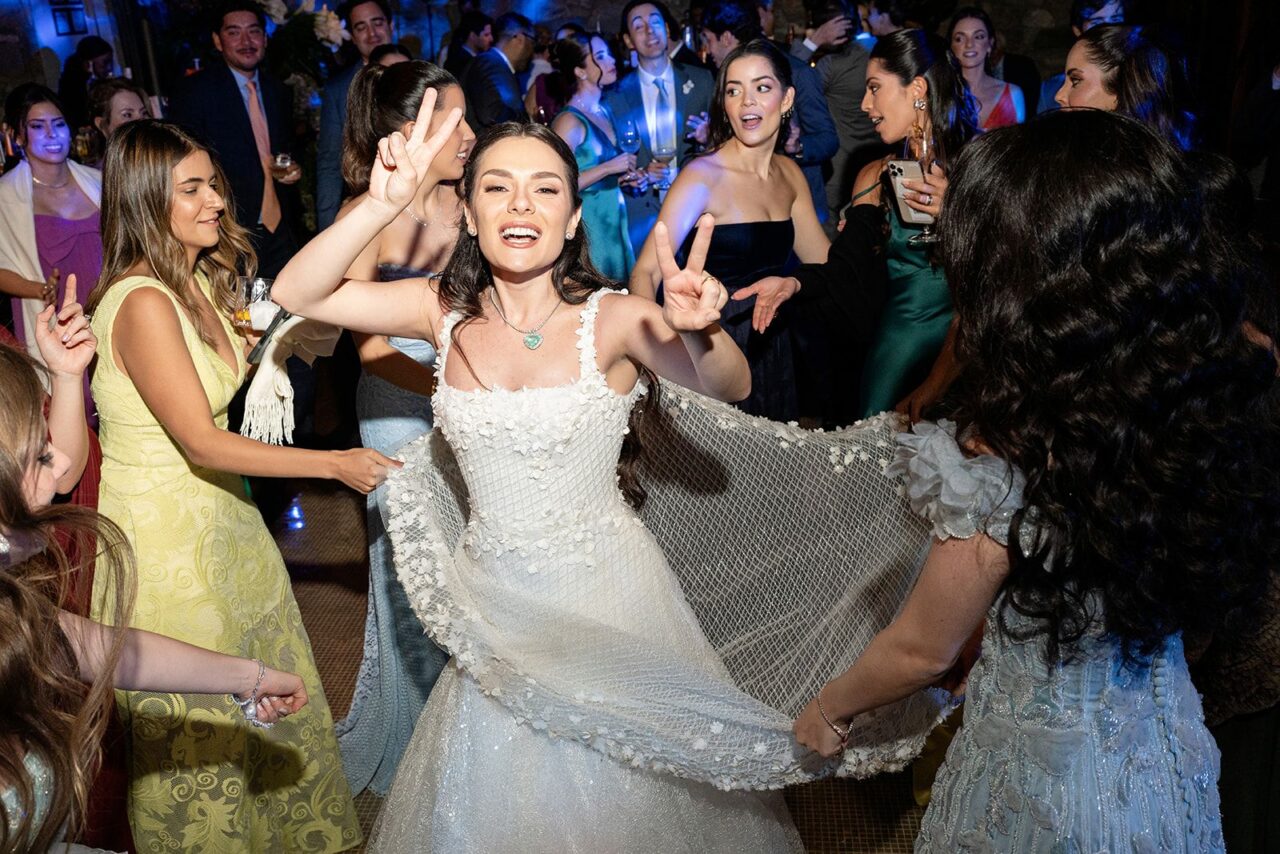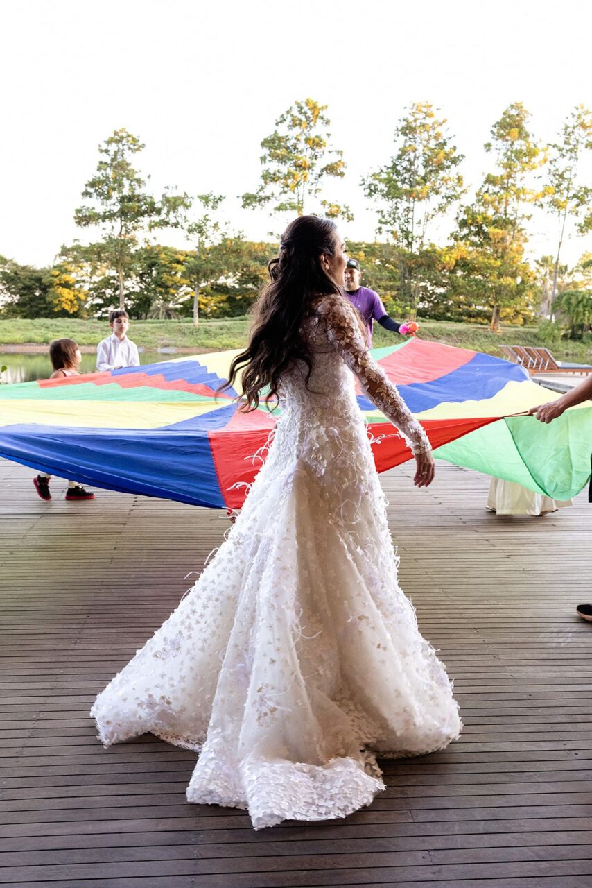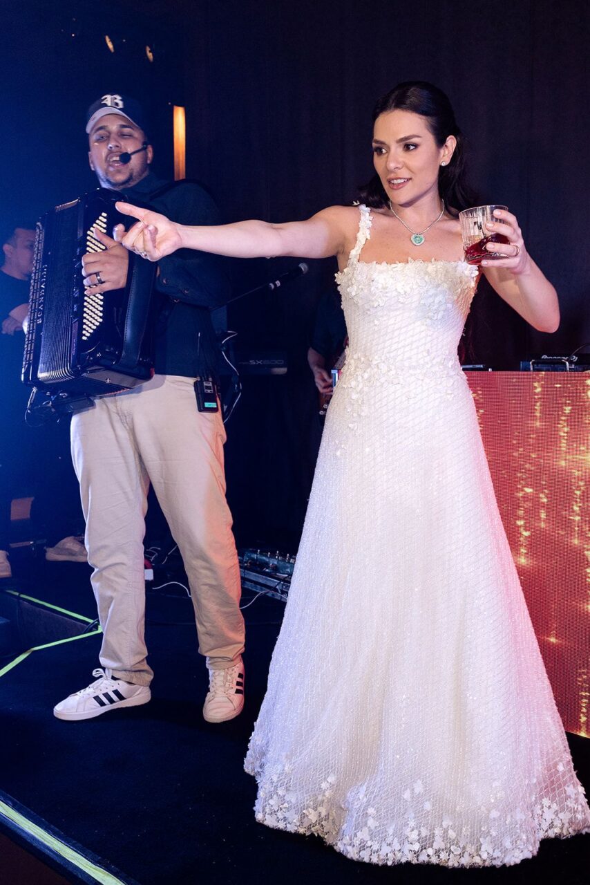 São dois vestidos em um – a parte com a gola e as mangas é um vestido inteiro de renda que é colocado por cima do vestido de alça , ele é removível, ele possui um fechamento nas costas até a parte de baixo. A cauda é neste vestido de cima, então depois para festa, quando você tira o vestido de cima, o vestido fica sem cauda pra recolher. A parte de cima possui recolhimento de cauda. As flores são todas coladas a mão, um é tecido Oscar De La Renta e o outro Ellie Saab, foram 6 mulheres para bordar a mão flor por flor durante 60 dias.