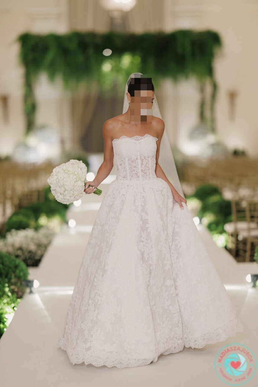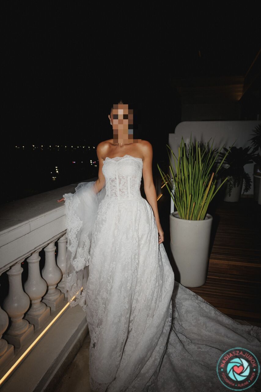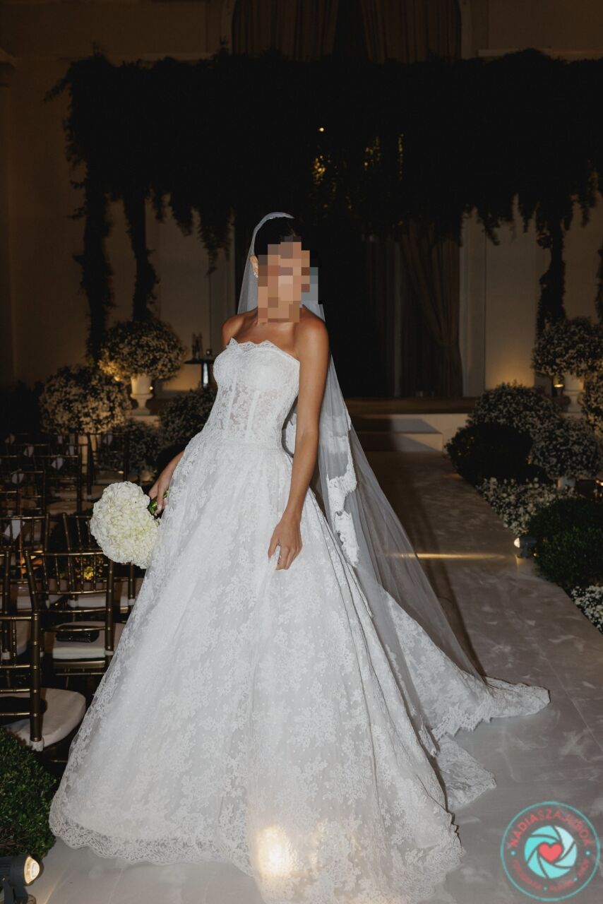 Apresenta defeito ou desgaste: O vestido esta em perfeito estado, sem nenhum marca de uso. Possui a calda de 1,5mts e os botoes para recolher caso necessario. O veu possui a mesma renda do vestido e 1,5mts para acompanhar a calda do vestido. Em baixo da renda, possui um tule de point d’Esprit, que realca o trabalho da renda importada. Possui bojo no seio e corset para dar sustentação ao vestido.