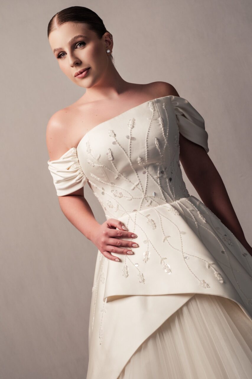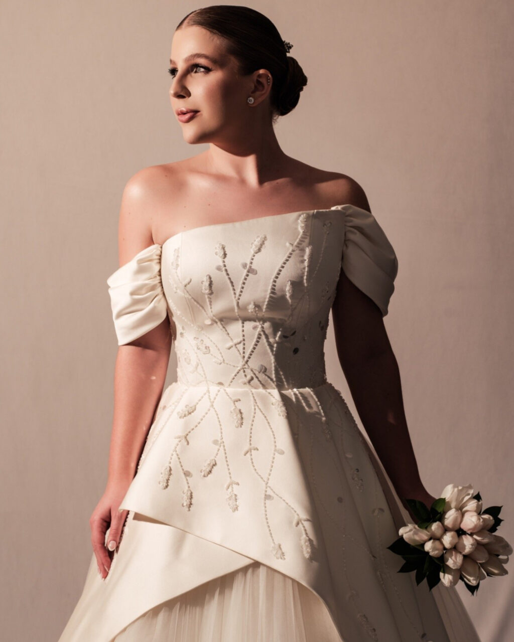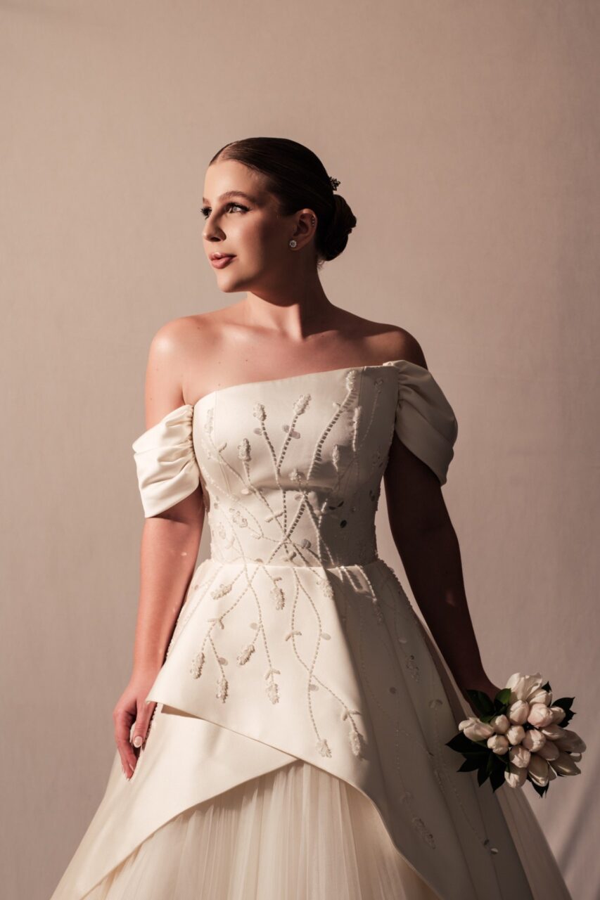 Apresenta defeito ou desgaste: Leve desgaste na barra, mas só perceptível bem de perto.Vestido longo em cetim duchese, na cor off white. Partesuperior estruturada em decote tomara que caia, mangas assimétrica removíveis, decote costas levemente em V com fechamento no centro. Saia longa em modelo godê, frente com max peplum/ babado que inicia curto seguindo até a barra do vestido, em cetim duchese. Parte superior ebabado, bordados manualmente. Saia godê em camadas de tule plissado, sob max peplum. Cauda removível, em cetim duchese, com peplum , finalizando com comprimento de 2,5 metros.