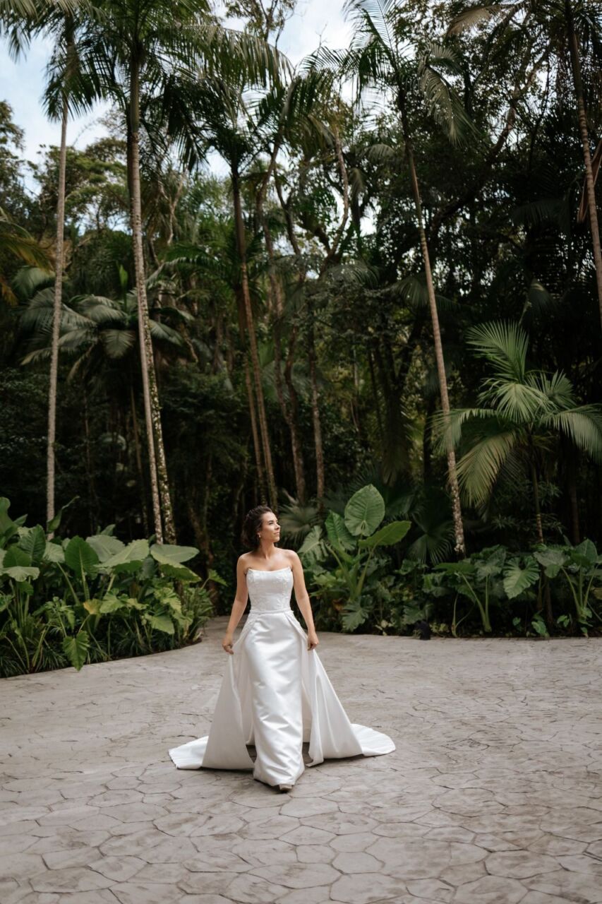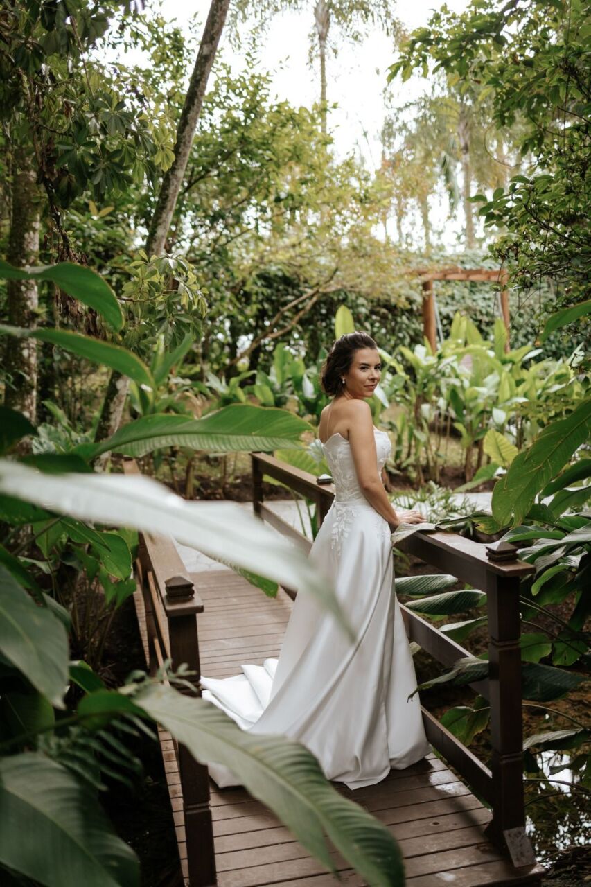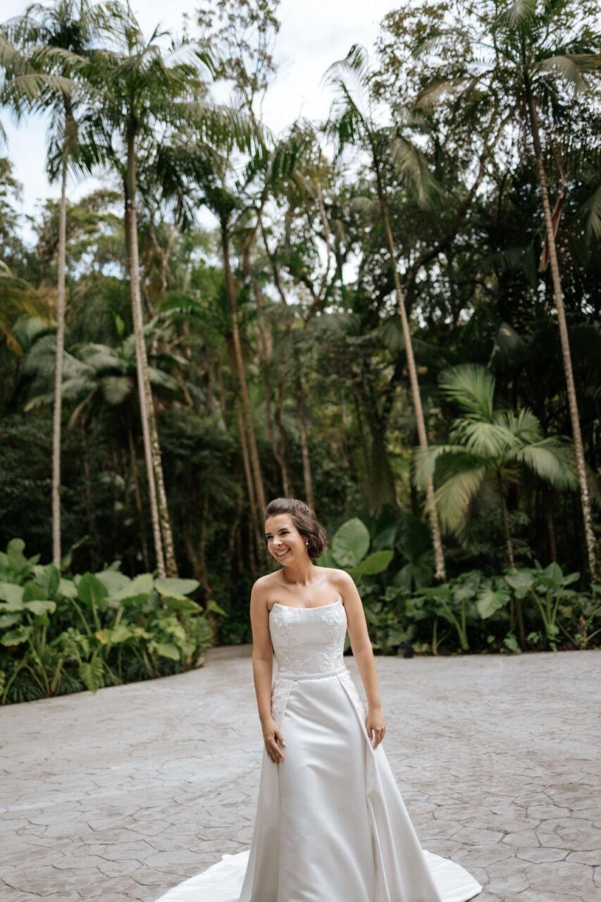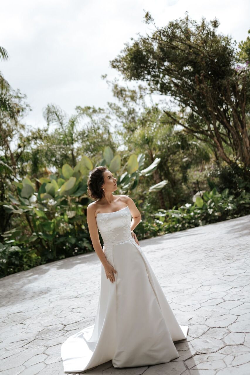 Apresenta defeito ou desgaste: Em perfeito estado, na mesma semana do casamento foi enviado para higienização. O vestido foi feito sob medida, mas pode ser ajustado em alguns locais. Quanto a altura, mesmo com o meu salto de 15 cm, ficou um bom tamanho arrastando. O vestido é 2 em 1.. A saia é removível.