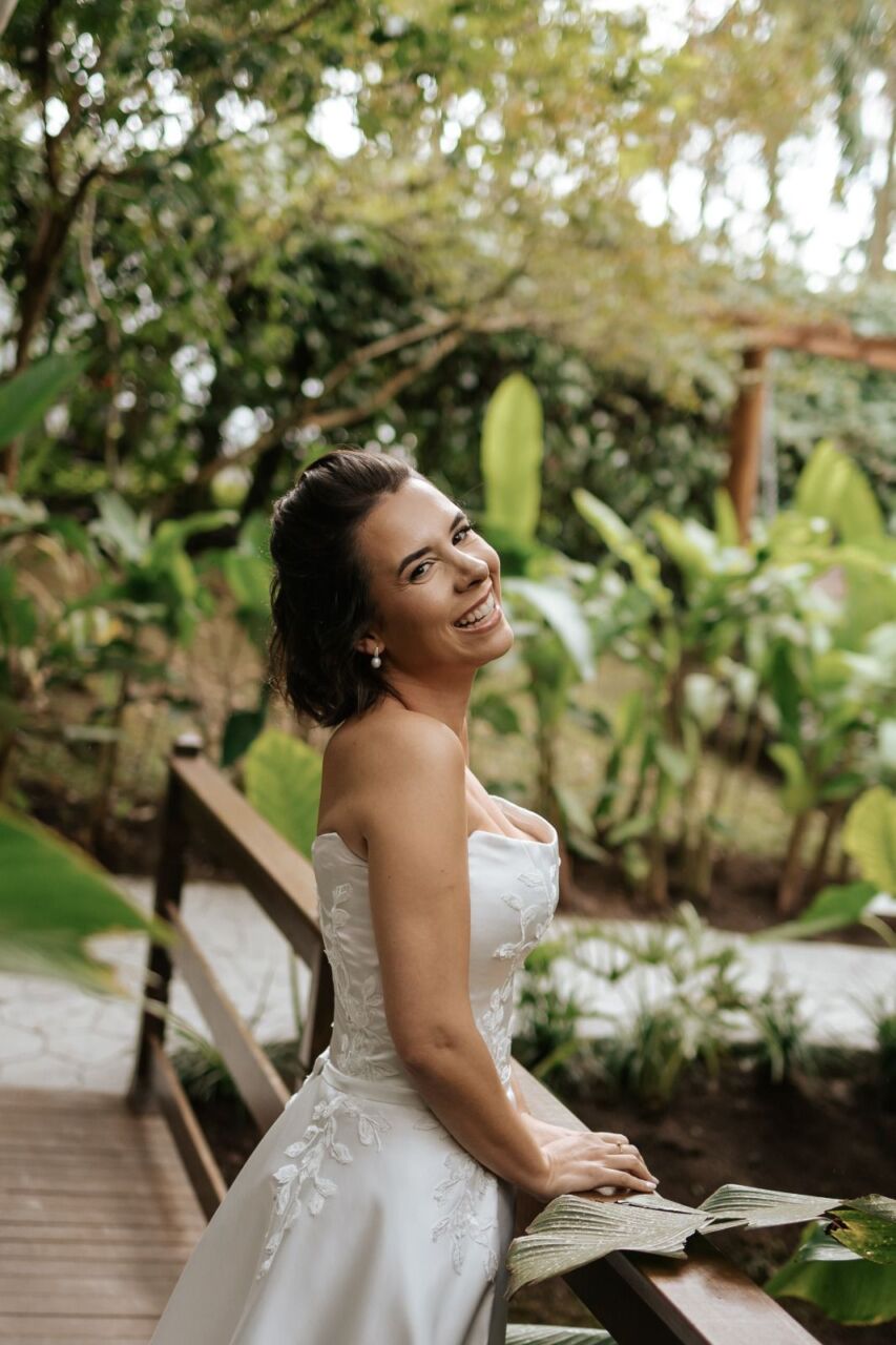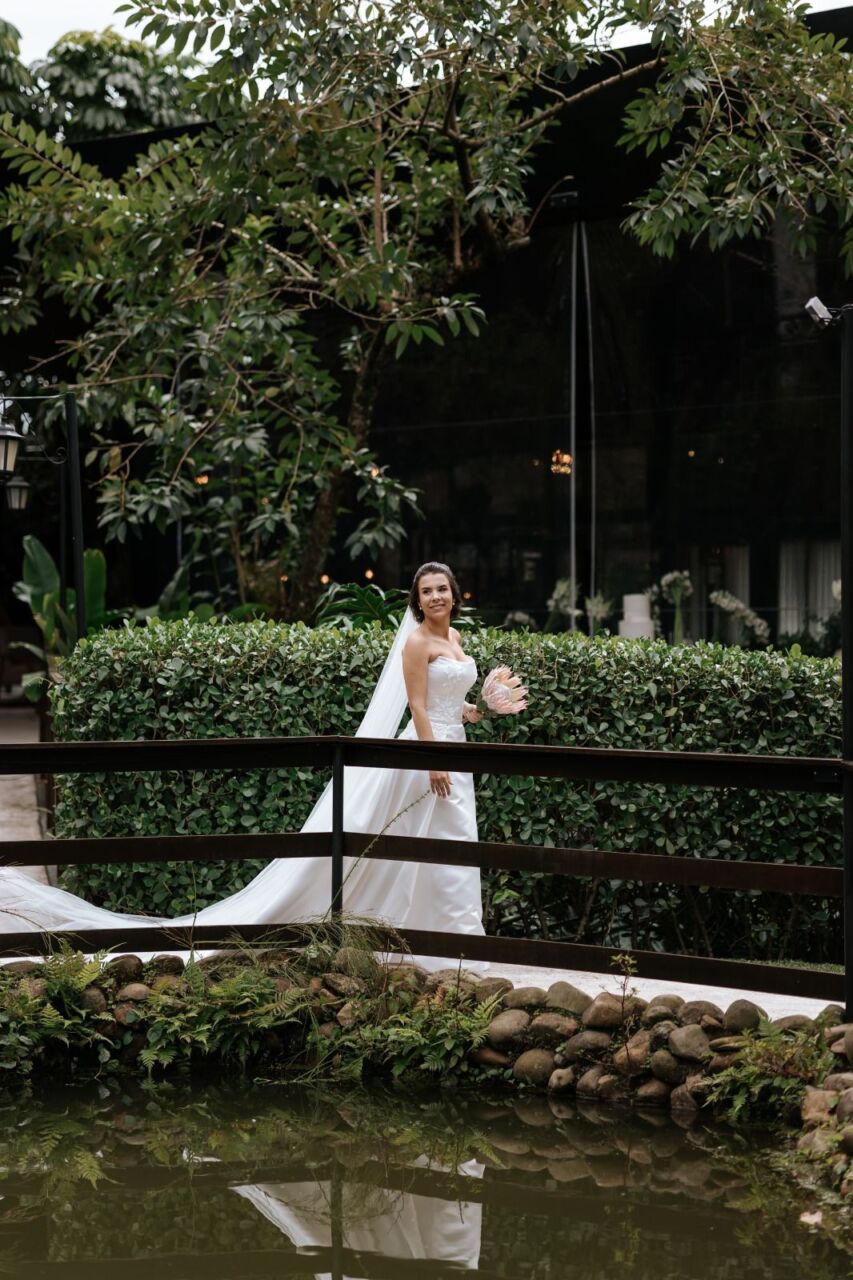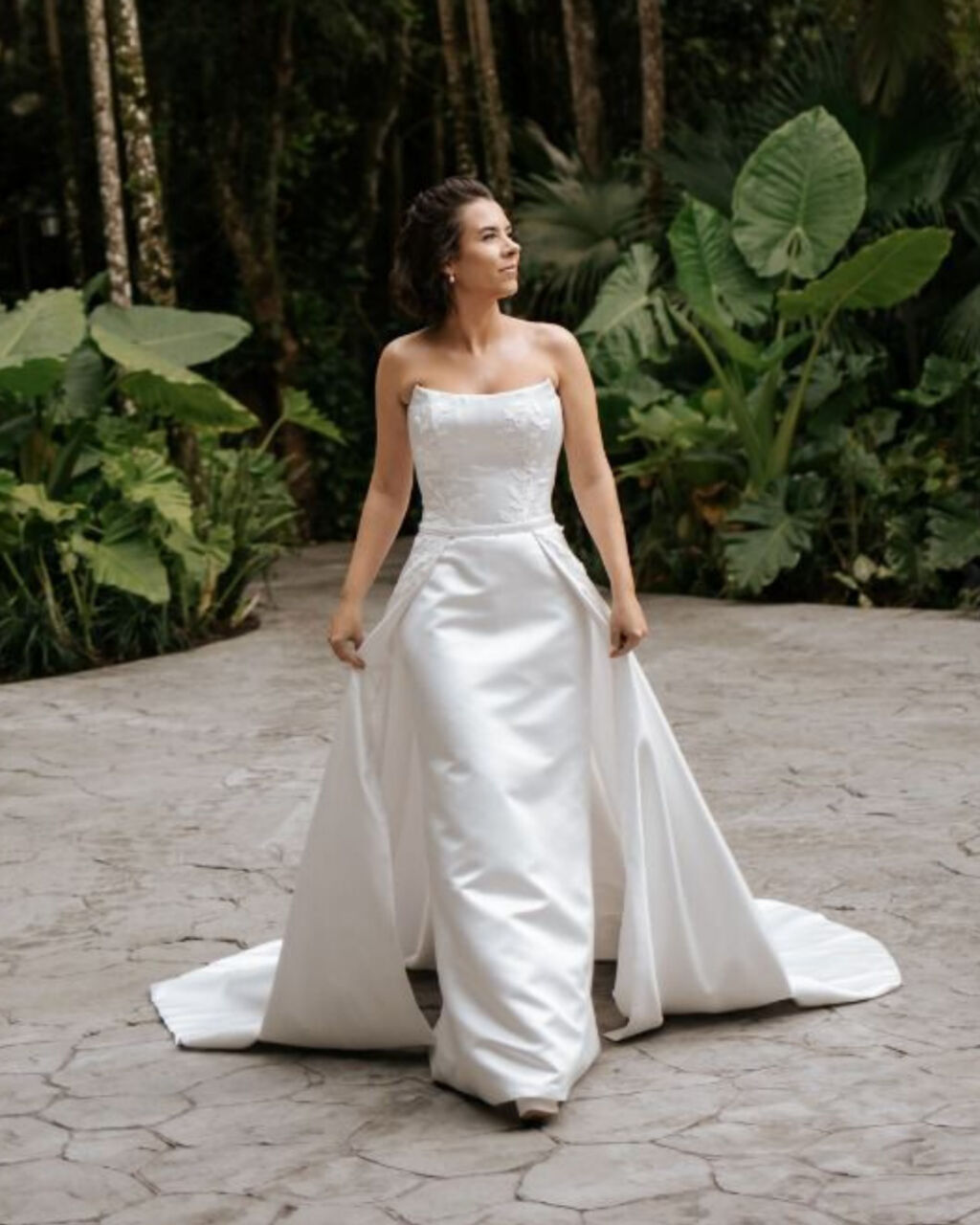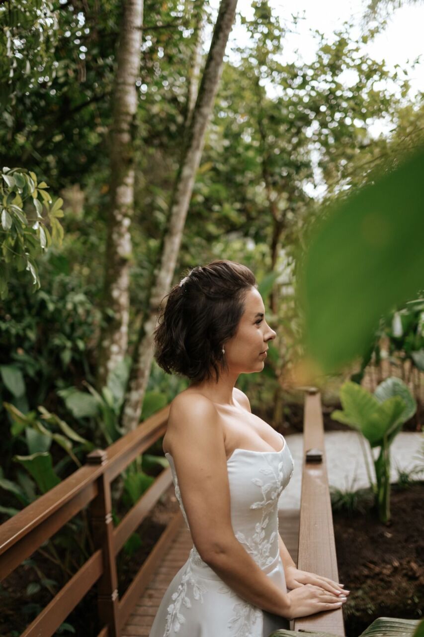 Apresenta defeito ou desgaste: Em perfeito estado, na mesma semana do casamento foi enviado para higienização. O vestido foi feito sob medida, mas pode ser ajustado em alguns locais. Quanto a altura, mesmo com o meu salto de 15 cm, ficou um bom tamanho arrastando. O vestido é 2 em 1.. A saia é removível.