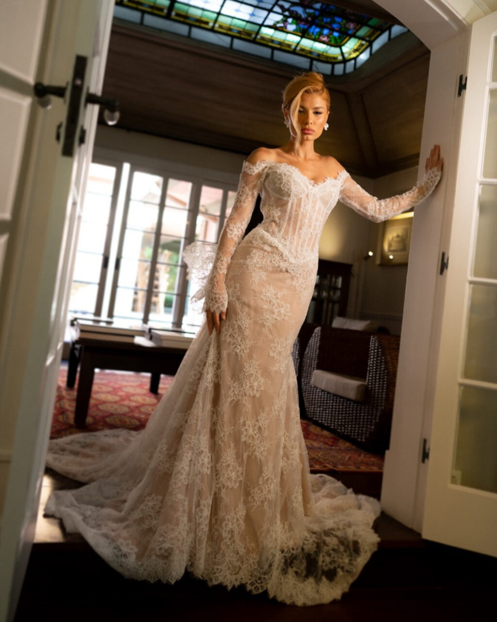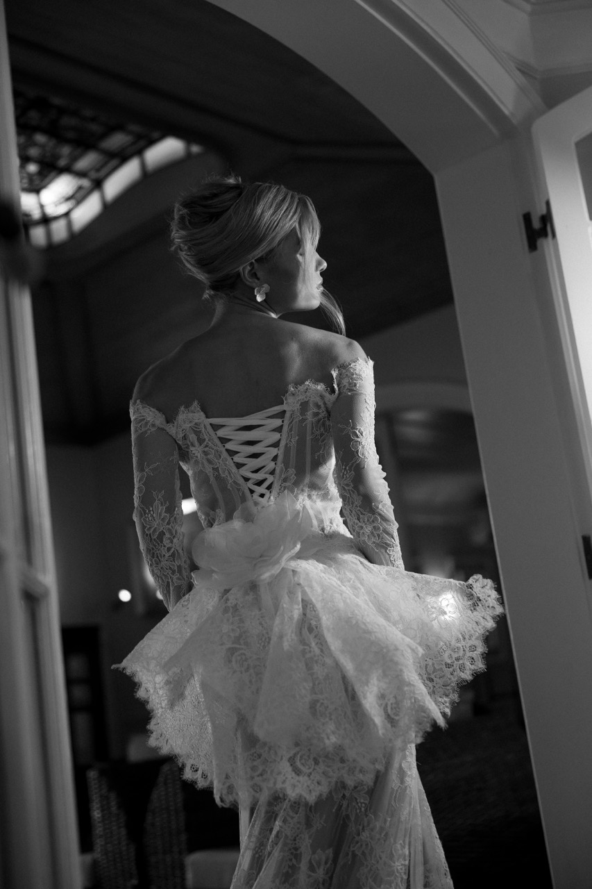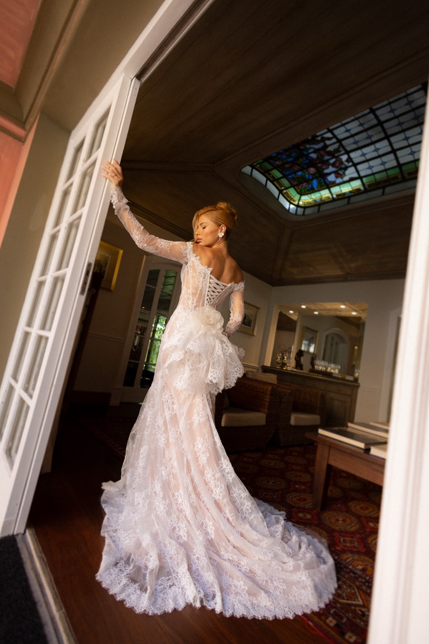 Apresenta defeito ou desgaste: O vestido foi criado para um editorial e utilizado apenas pela modelo. Vestido de renda, semi sereia com forro cor beige, renda tipo francesa com soutache. Busto espartilhado e com barbatanas aparentes. Mangas longas, justas e fixa, sobrepondo as mãos. Espartilho ajustável nas costas. Detalhe removível no bumbum (Veste manequim 36).