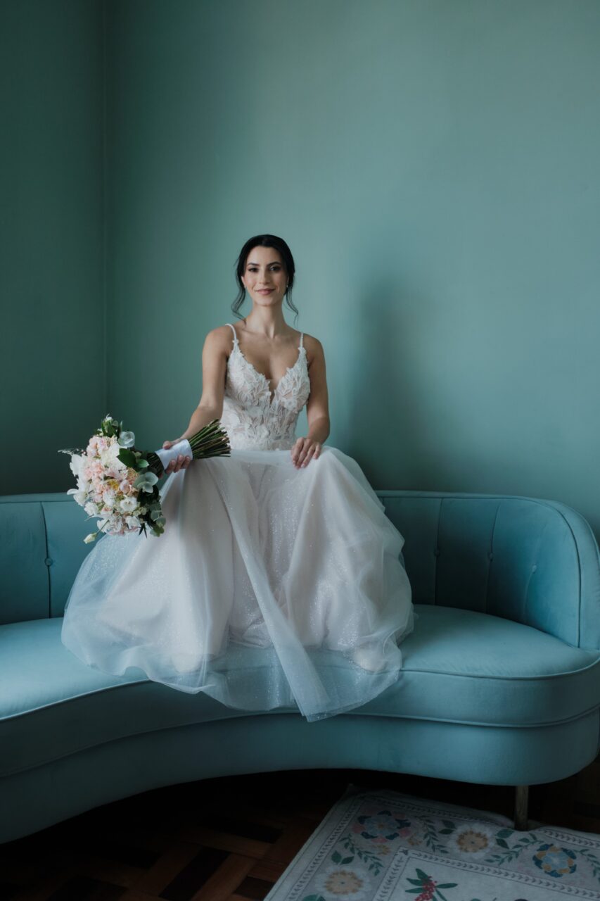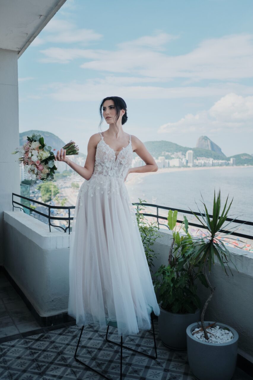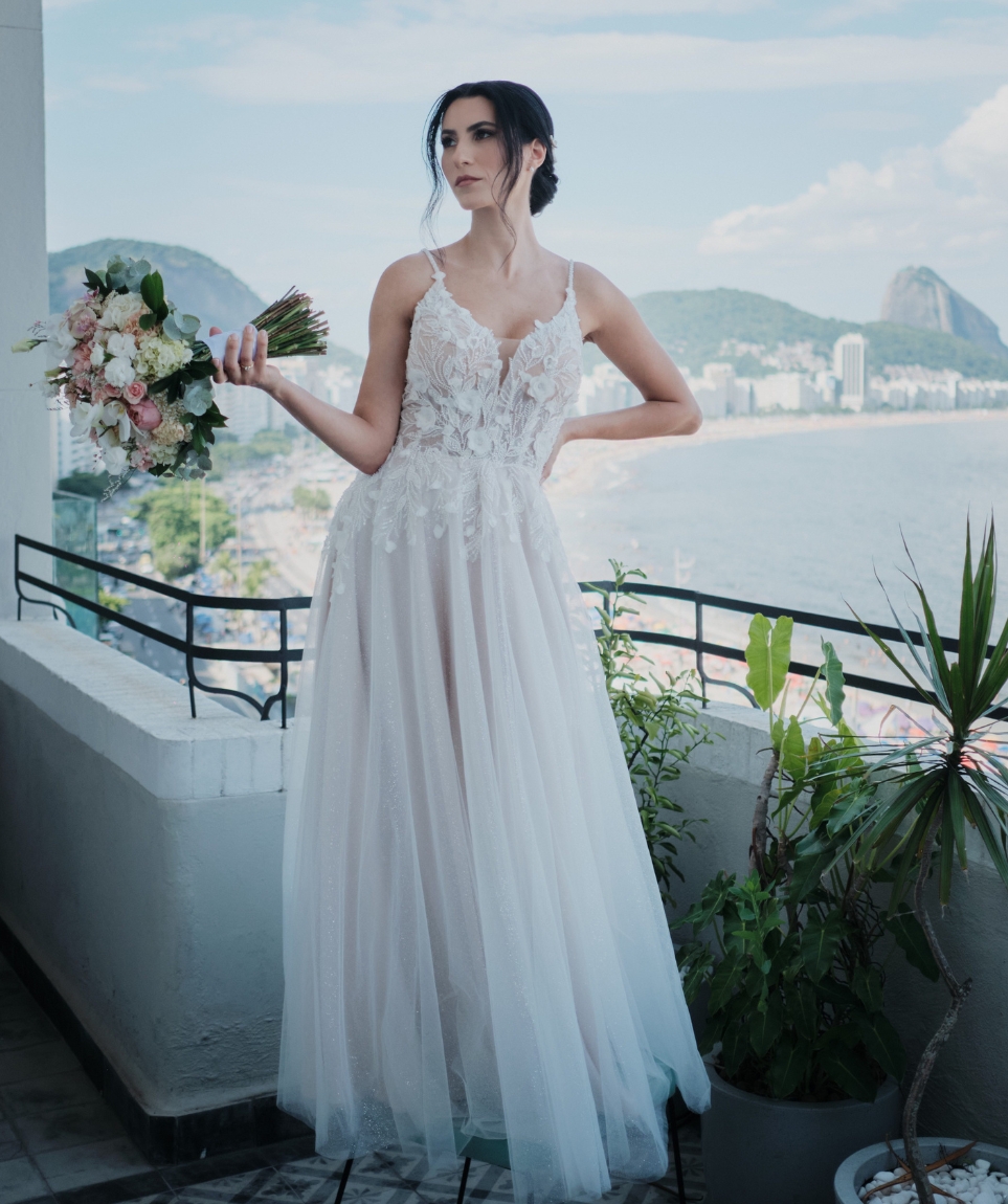 Apresenta defeito ou desgaste: Sem defeitos ou desgaste. Não tirei o salto durante a festa, então o vestido não manchou a barra. Depois de lavado o vestido voltou em perfeito estado, como se fosse novo e nunca usado. Grinalda feita à mão por SA NOIVAS Grinaldas Artesanais (RJ). Vestido comprado na Alemanha, marca Bridonista.