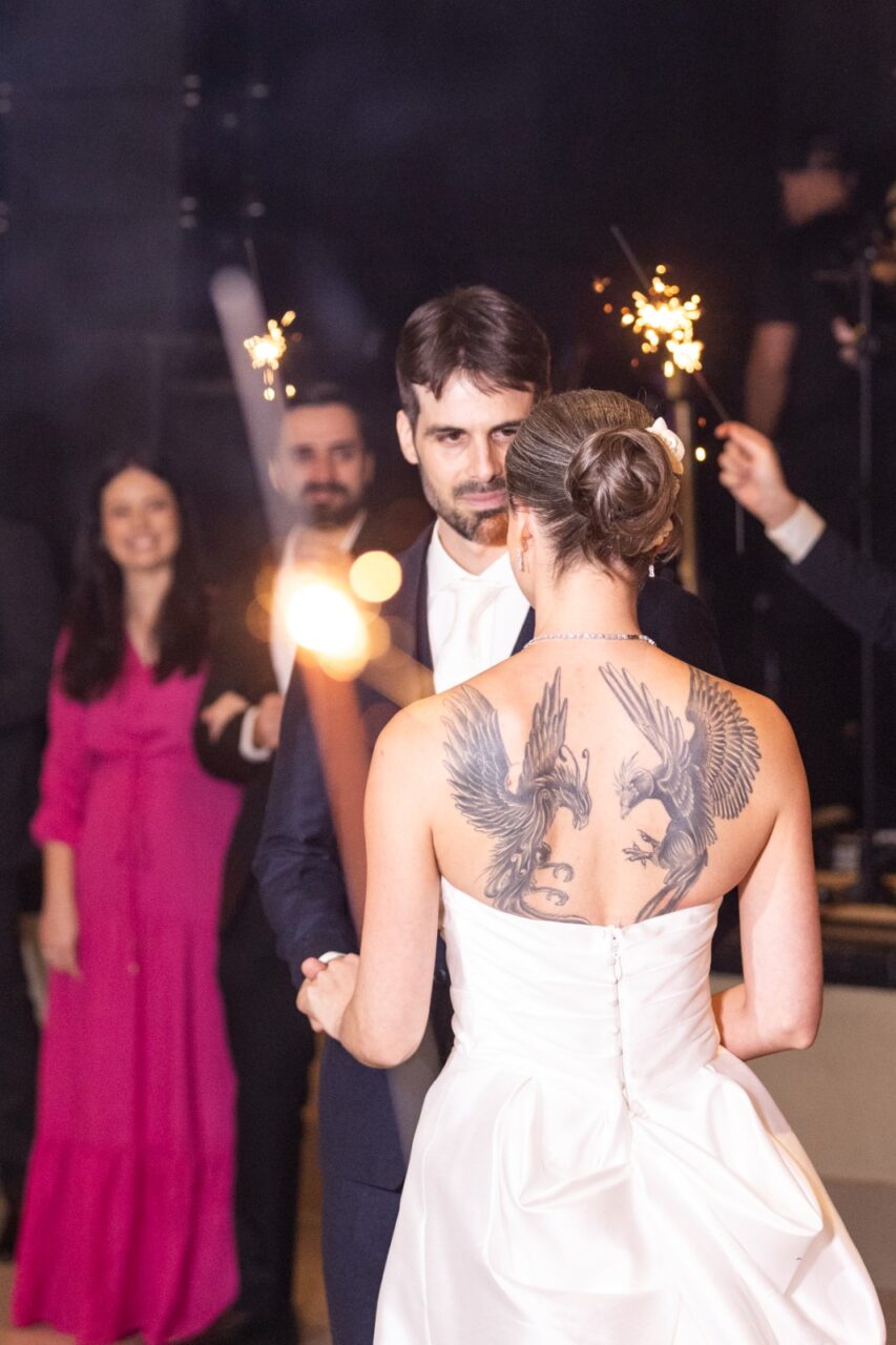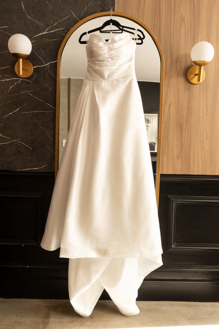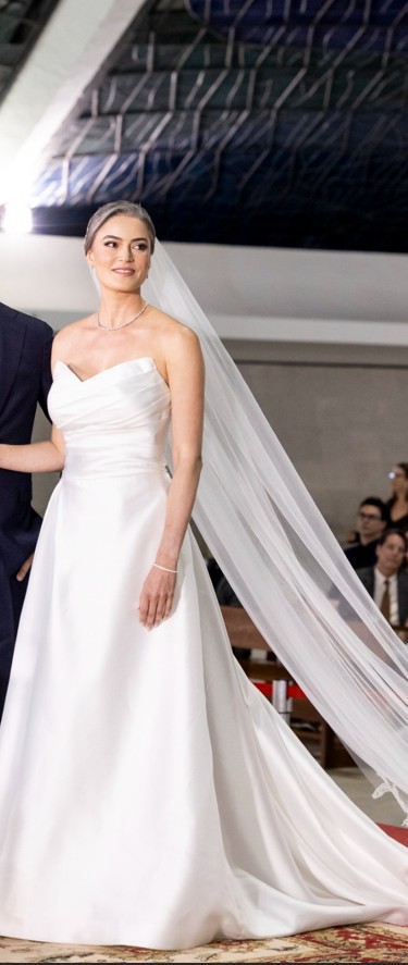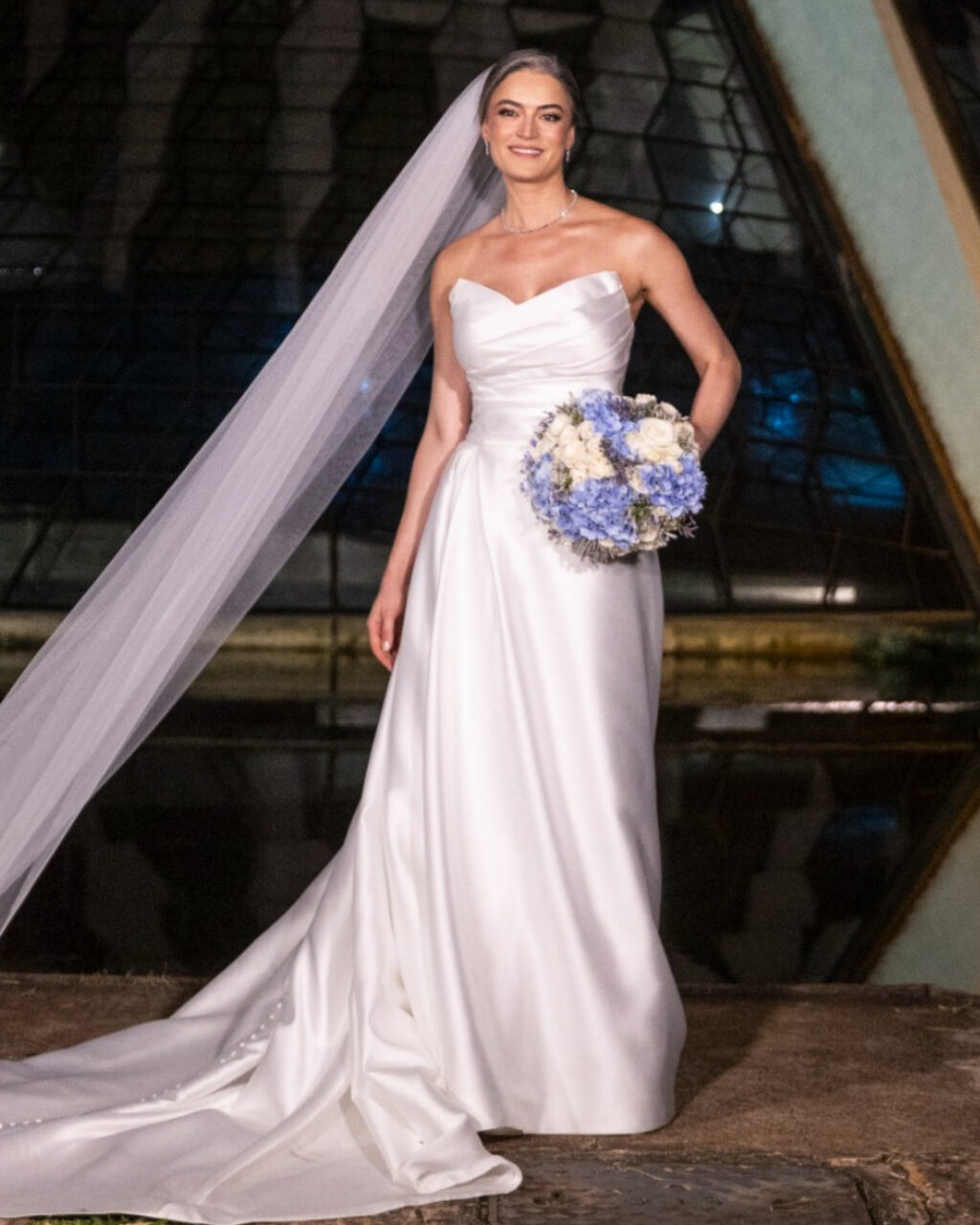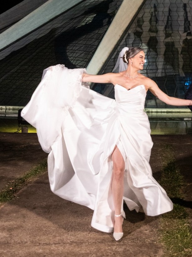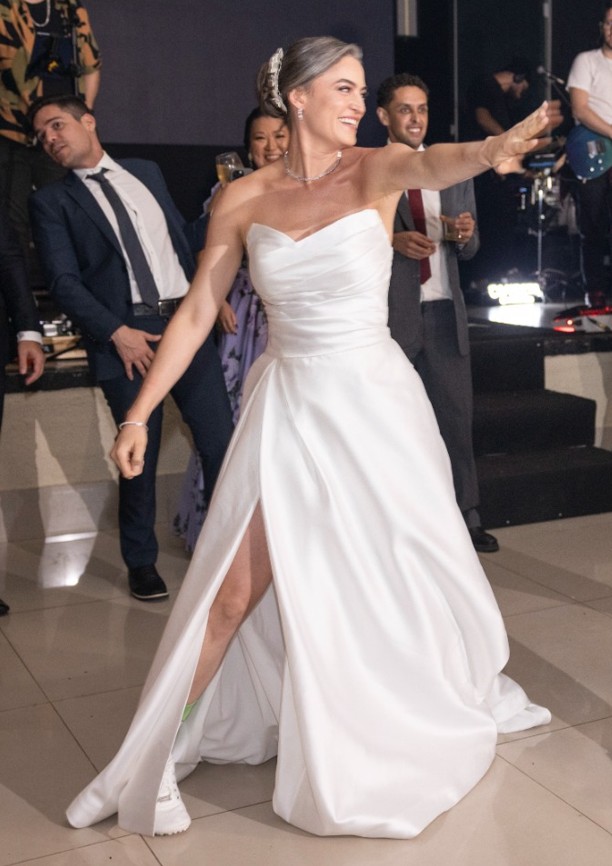 Apresenta defeito ou desgaste: O vestido está impecável. Isto é uma virginiana falando! Rs… Está realmente noviiinho! Como eu tinha um segundo vestido para a festa, eu só usei este na cerimônia e no iníciozinho da festa. Então, continua novinho em folha. Já está lavado, inclusive.Para o vestido firmar bem e não ficar caindo, eu (uma costureira na Alemanha) reforcei as estruturas internas. Então, ficou confortável e não caiu nadinha!Para prender a cauda depois da cerimônia, reforçamos as casas dos botões da cauda.O vestido tem tamanho original 46, se lembro bem. A costureira reduziu até o 36-38, e, sinceramente, ficou mais bonito do que o modelo original, porque as pontinhas do tomara que caia ficaram bem no canto, perto das axilas, e o colo ficou muito mais bonito.Além disso, como eu estava com 1,80m de salto, o vestido é beeeem longo. Dá para cortar, caso precise.