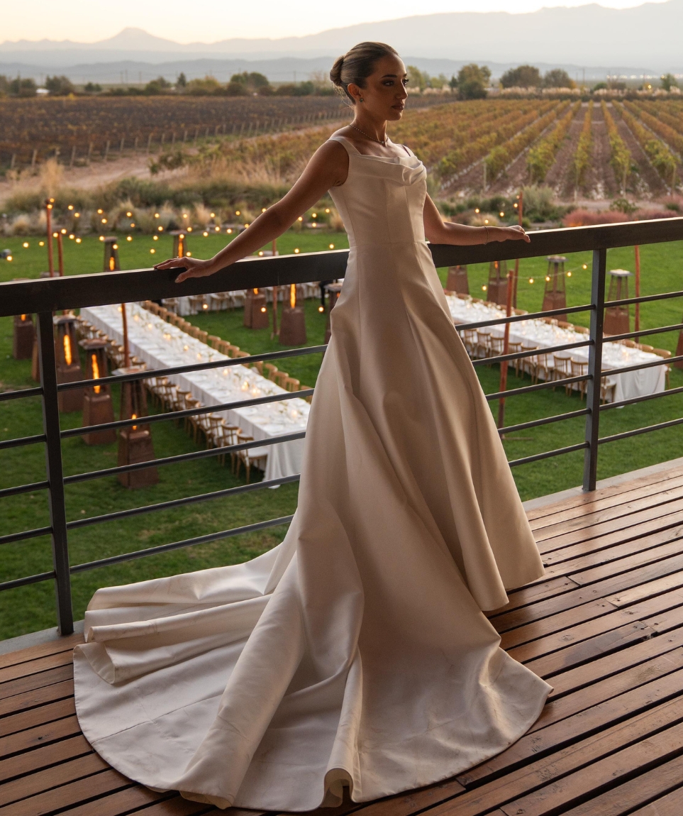 Apresenta defeito ou desgaste: Não Vestido de noiva feito sob medida decote quadrado, com pregas no busto, shape saia em nesgas. Decote costas. Véu liso incluso.Tecido plano levemente acetinado, sem bordados.