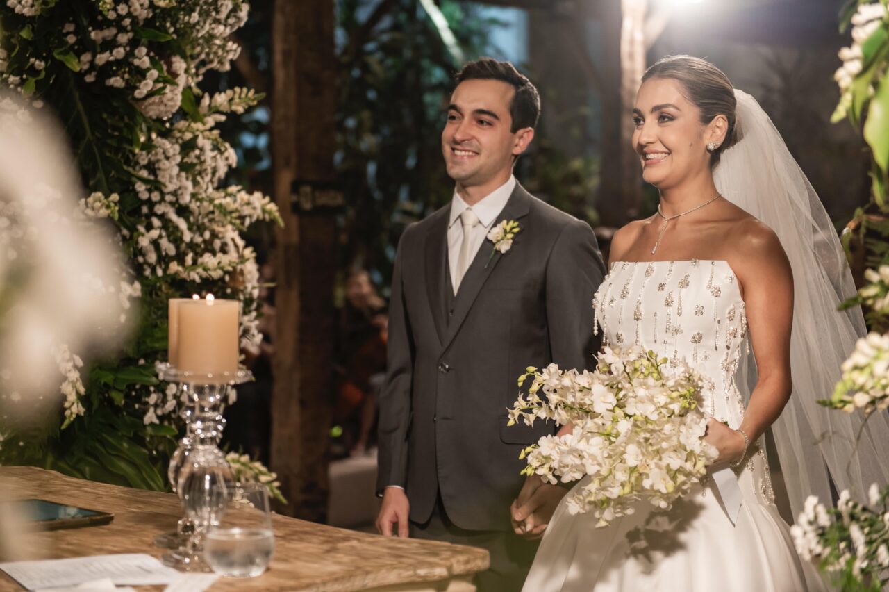 Apresenta defeito ou desgaste: Vestido feito em crepe, tomara que caia, todo reforçado por dentro com elástico para garantir firmeza durante todo o evento. Cintura baixa e assimétrica, bordado a mão em cristais em toda a parte de cima, todos os bordados íntegros. Permaneci de salto durante todo o casamento, desta forma o desgaste/sujeira da barra foi mínimo e mandei lavar o vestido na segunda-feira após o casamento para que não ficasse nada manchado.