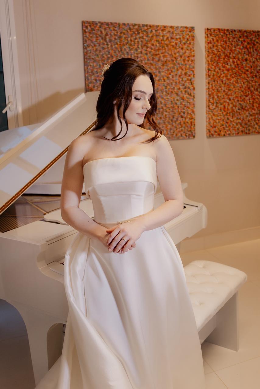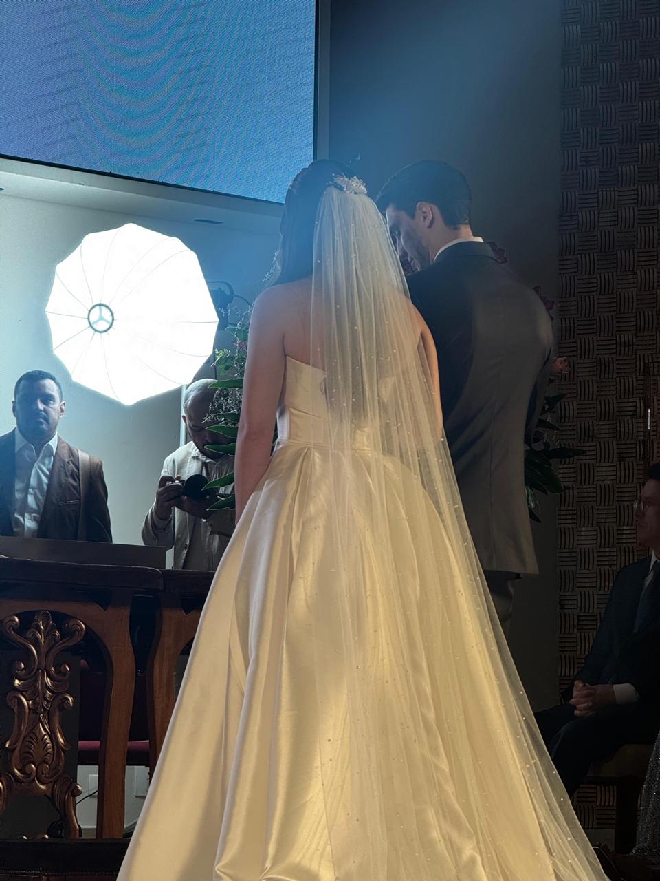 Apresenta defeito ou desgaste: Cauda removível, barra do vestido sem bordado e véu com pérolas.