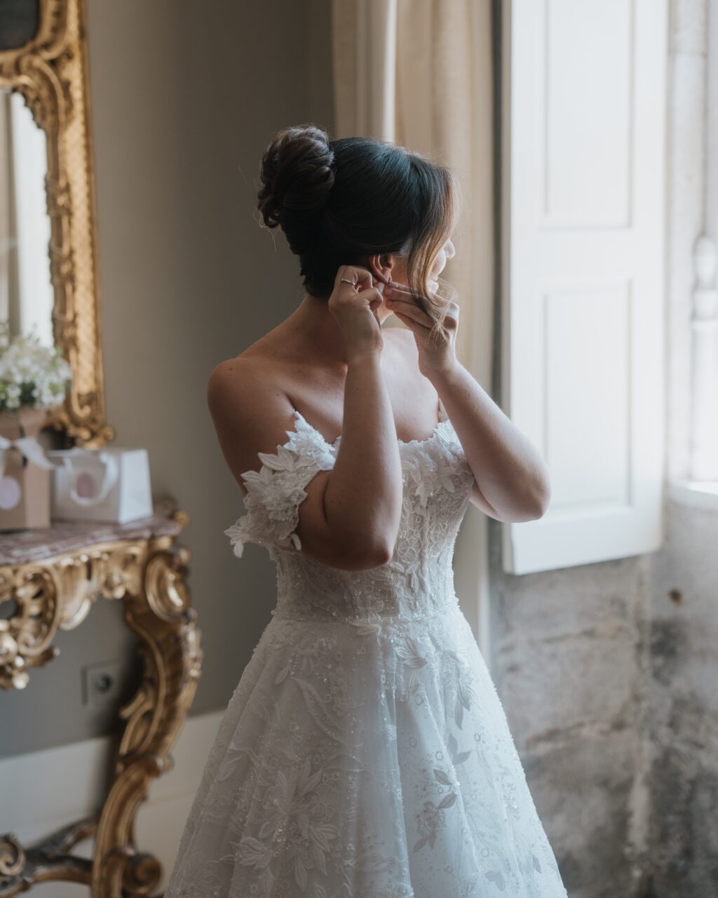 Apresenta defeito ou desgaste: Sem defeitos ou desgastes, já lavado e armazenado na capa original.Vestido de noiva rico em renda e aplicações de pedrarias. Acompanha alças removíveis. Fechamento nas costas com fileira de botões delicados.