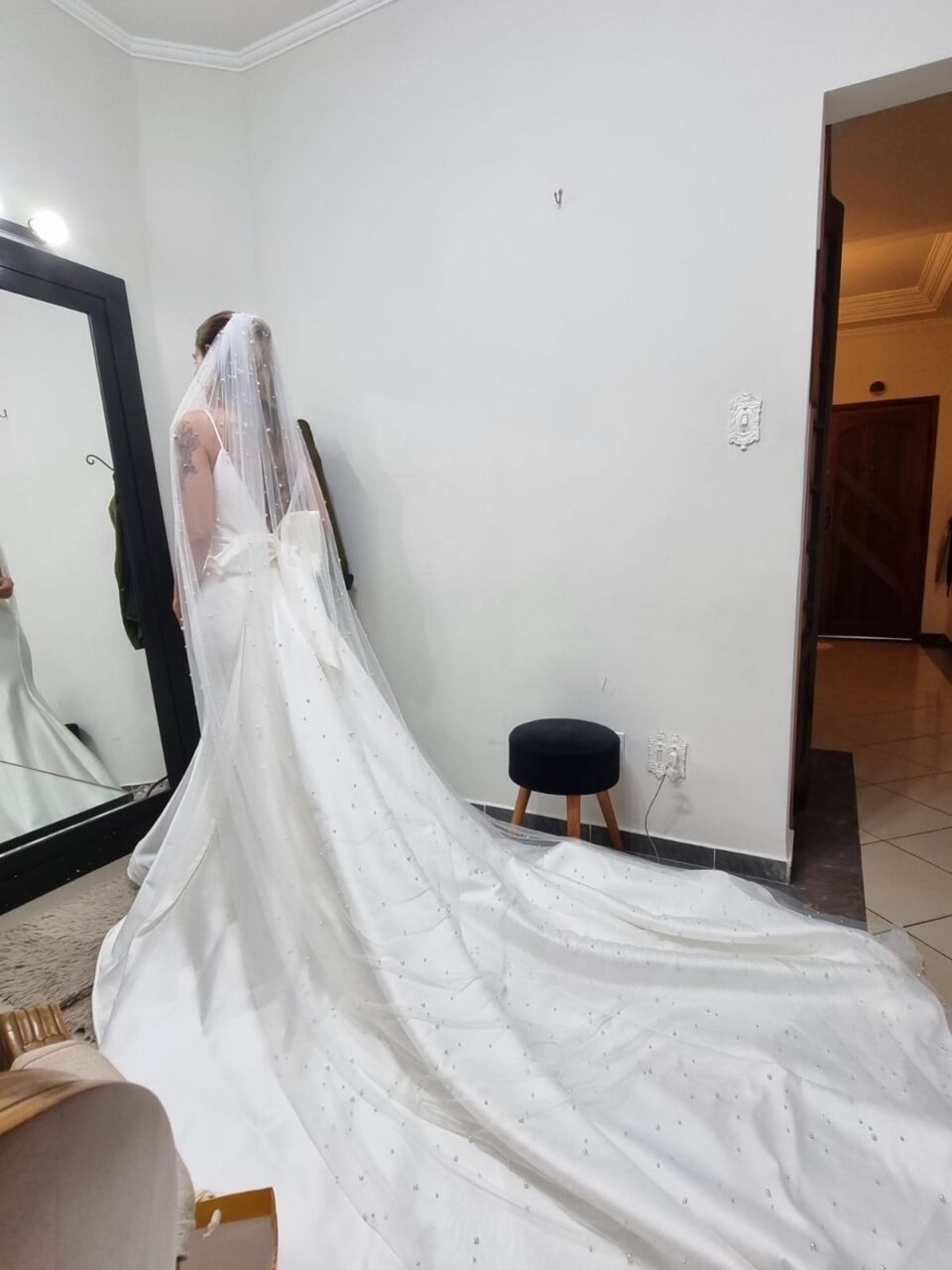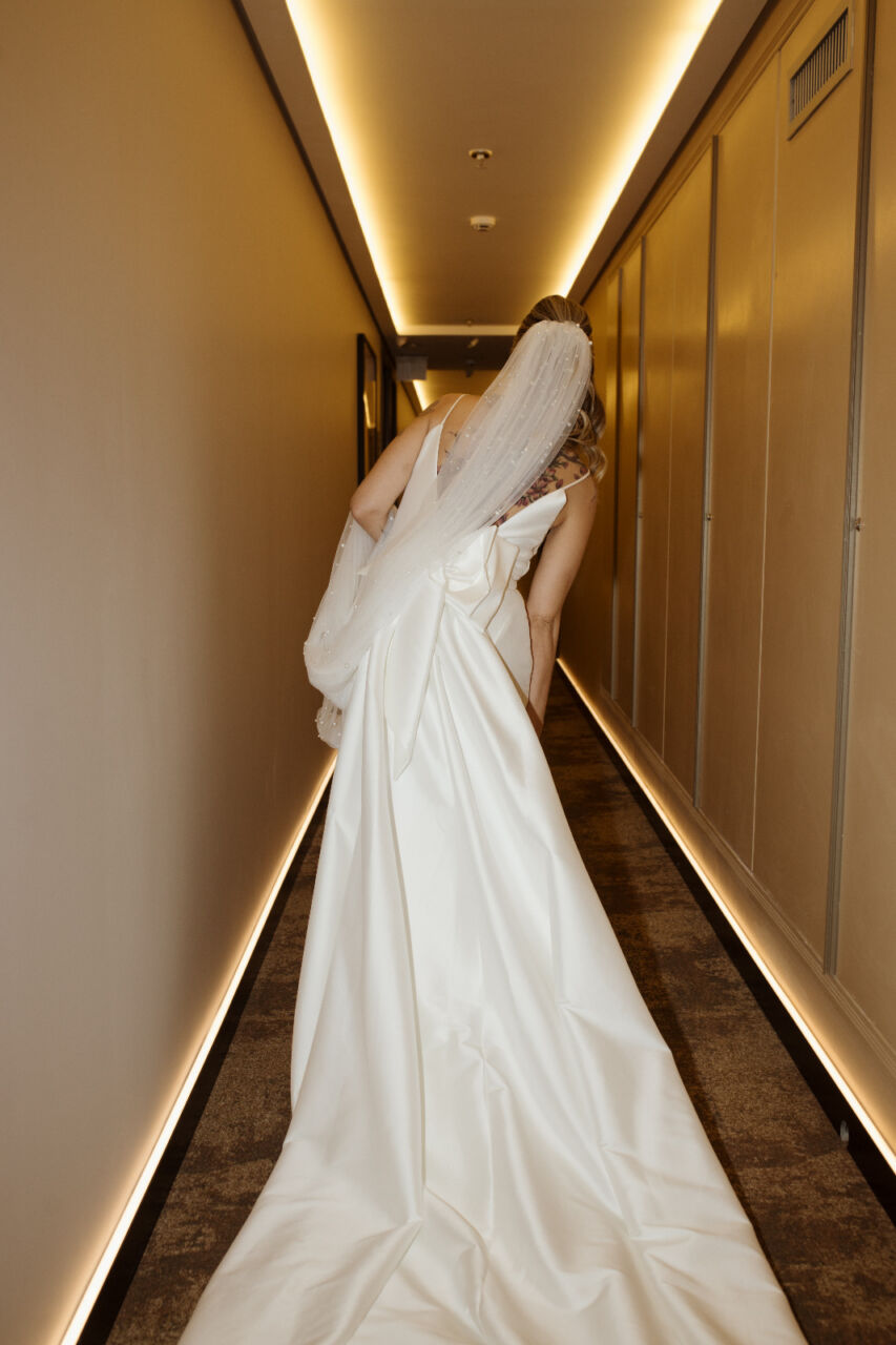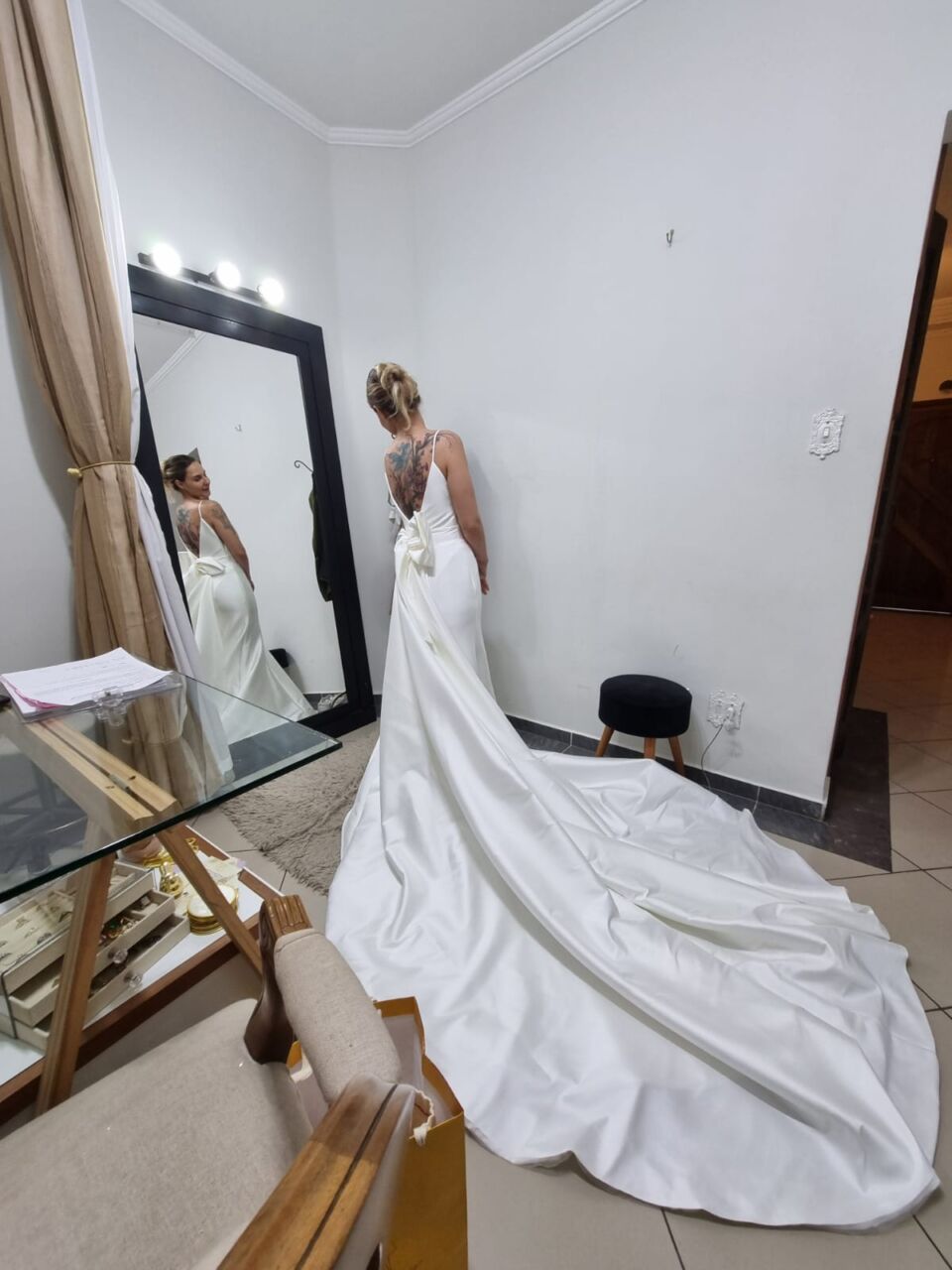 Apresenta defeito ou desgaste: Não, vestido está perfeito, lavado e passado. Ele possui uma cauda removível e quando fiz a barra, pedi para a costureira deixar uma folga de uns 10cm, e nas laterais também pedi para ela deixar uma ‘sobra’ caso fosse necessário ajustar futuramente. Fiz os ajustes na Eu Noiva Atelier (ela tem o histórico do que foi feito)