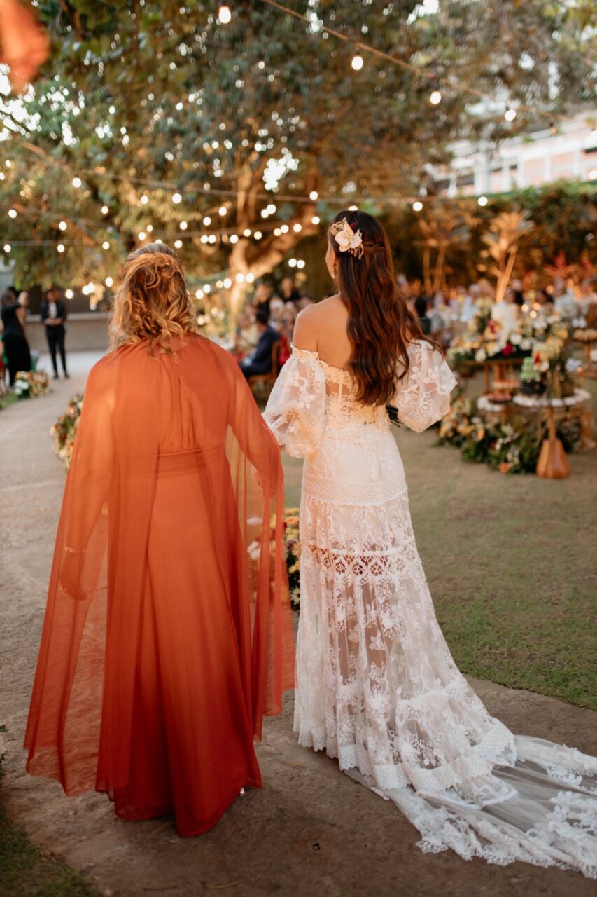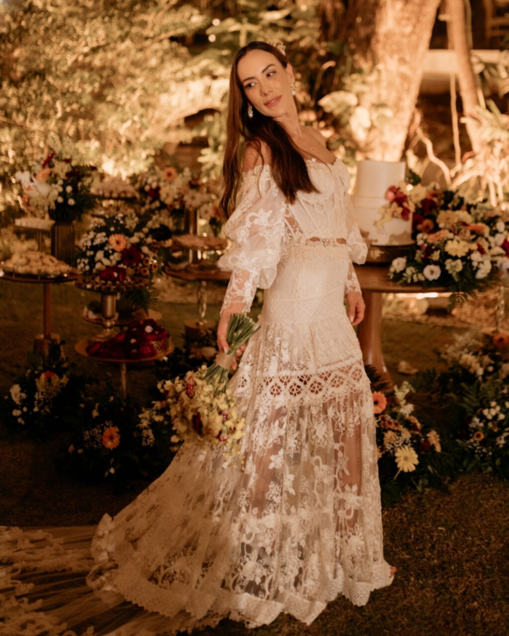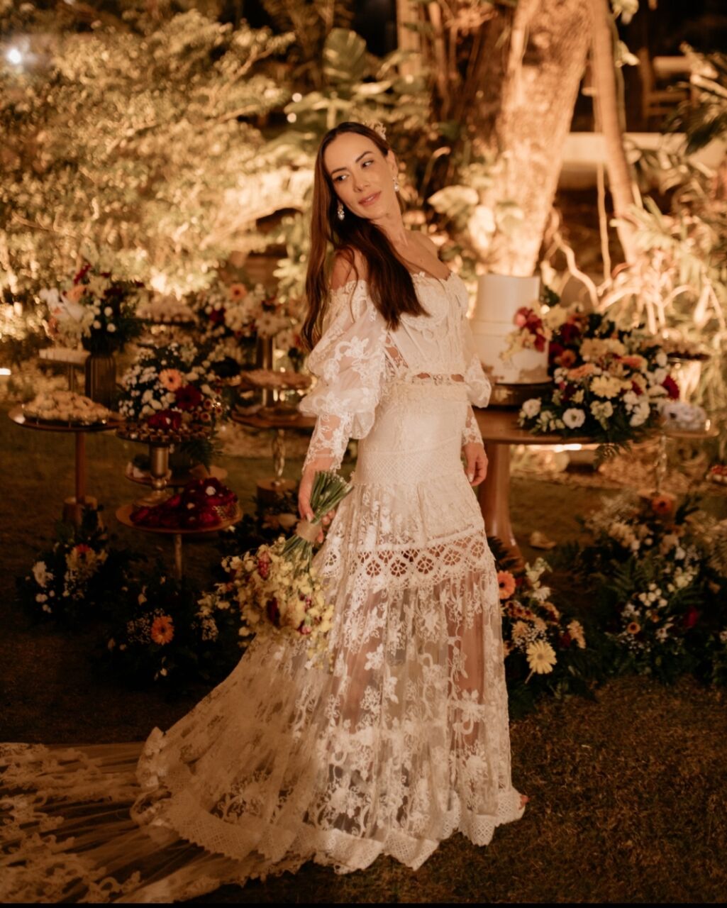 Apresenta defeito ou desgaste: O vestido foi usado apenas uma vez em dezembro de 2025, apresenta pequena avaria na barra, com discretas manchas. Não apresenta rasgos. É um vestido completamente bordado a mão, muito delicado, excelente para casamentos no campo. Veste bem manequins número 36.Fiz ajuste para o meu corpo e disponibilizo renda extra para se forem necessários ajustes.